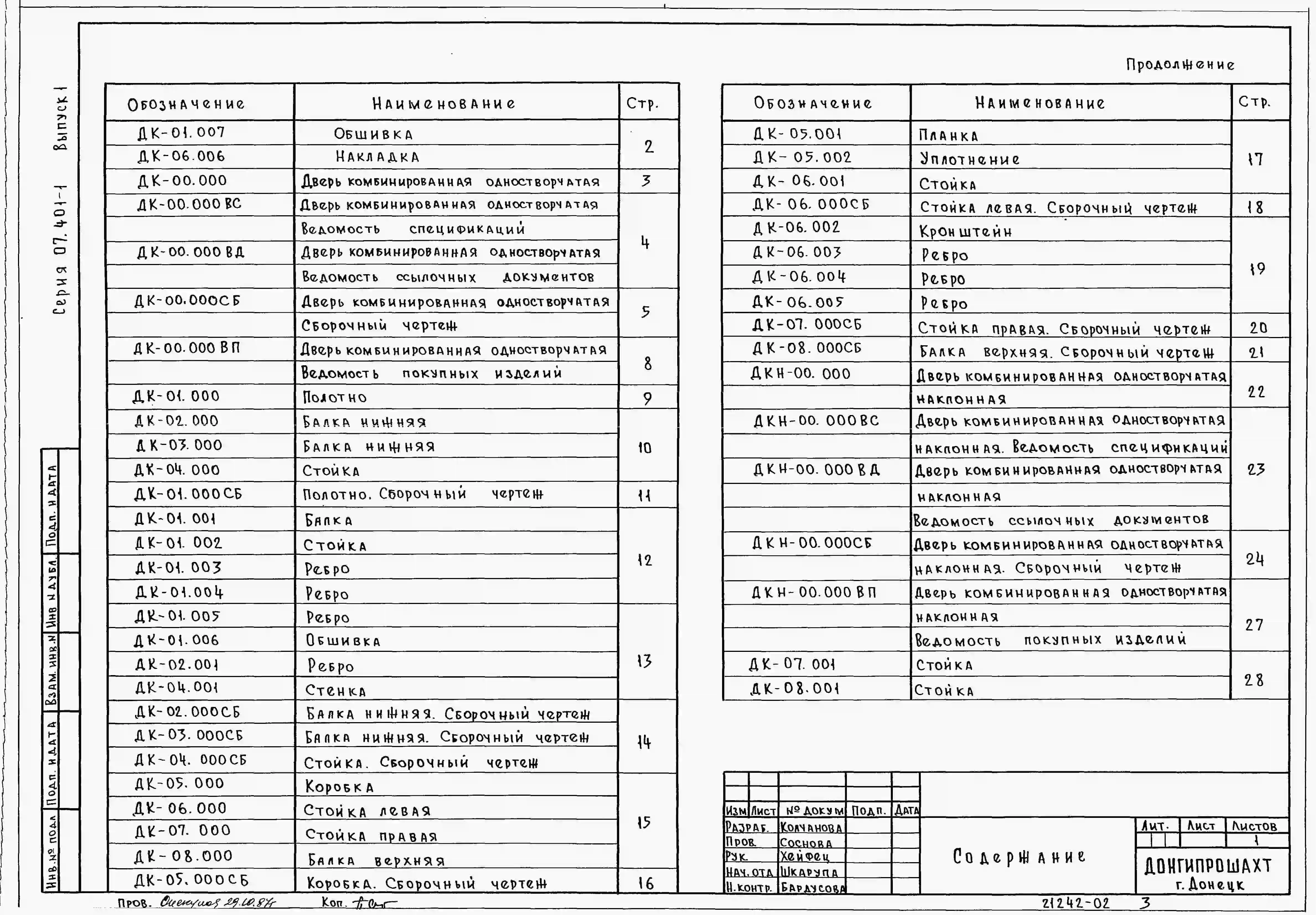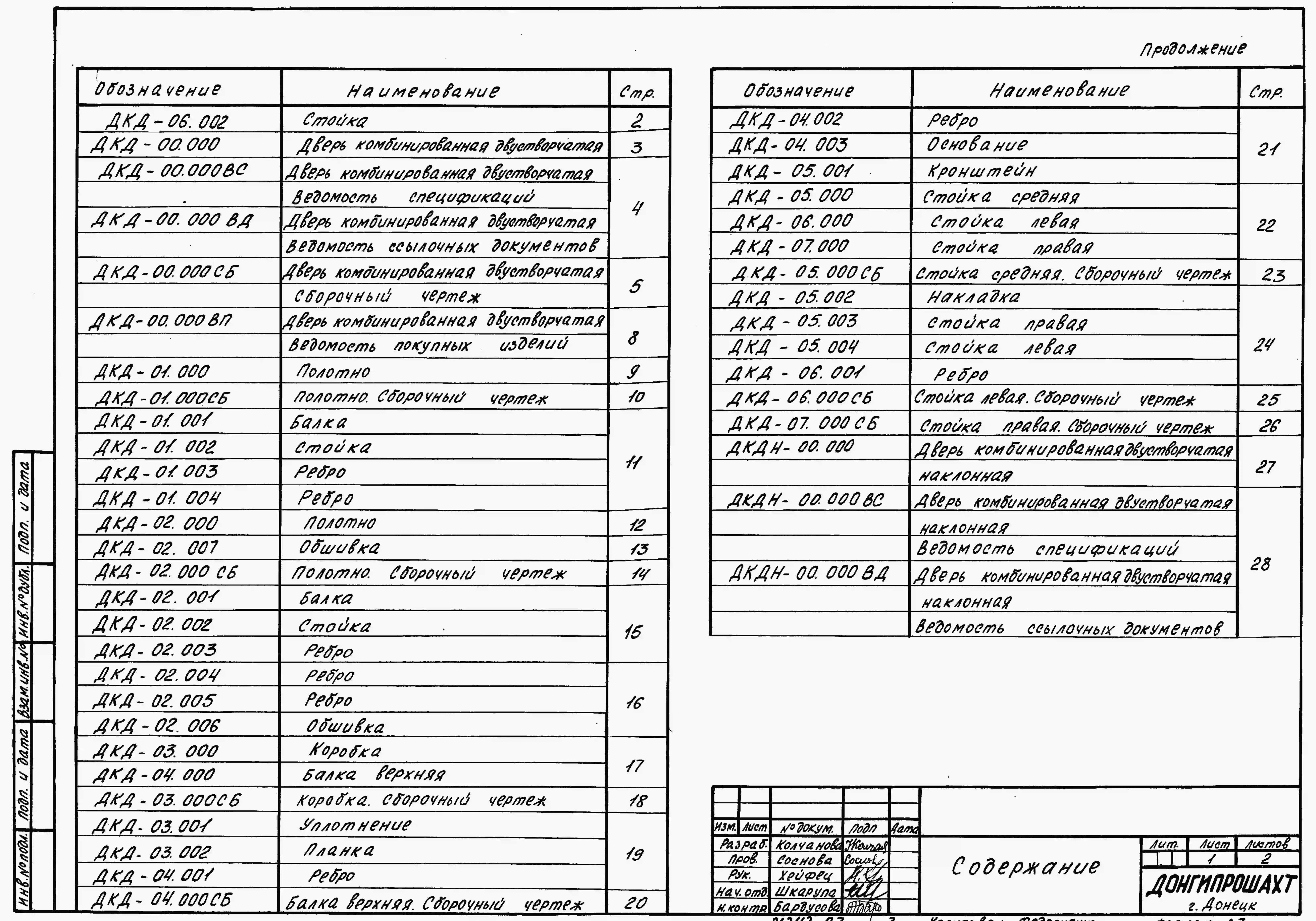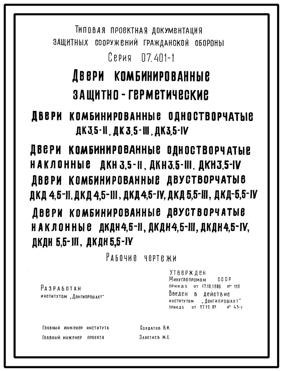 Серия 07.401-1 Двери комбинированные защитно-герметические в горных выработках. Двери одностворчатые и двустворчатые. ДК 3,5-2, ДК 3,5-3, ДК 3,5-4, ДКН 3,5-2, ДКН 3,5-3, ДКН 3,5-4, ДКД 4,5-2, ДКД 4,5-3, ДКД 5,5-3, ДКД 5,5-4, ДКДН Рабочие чертежи.