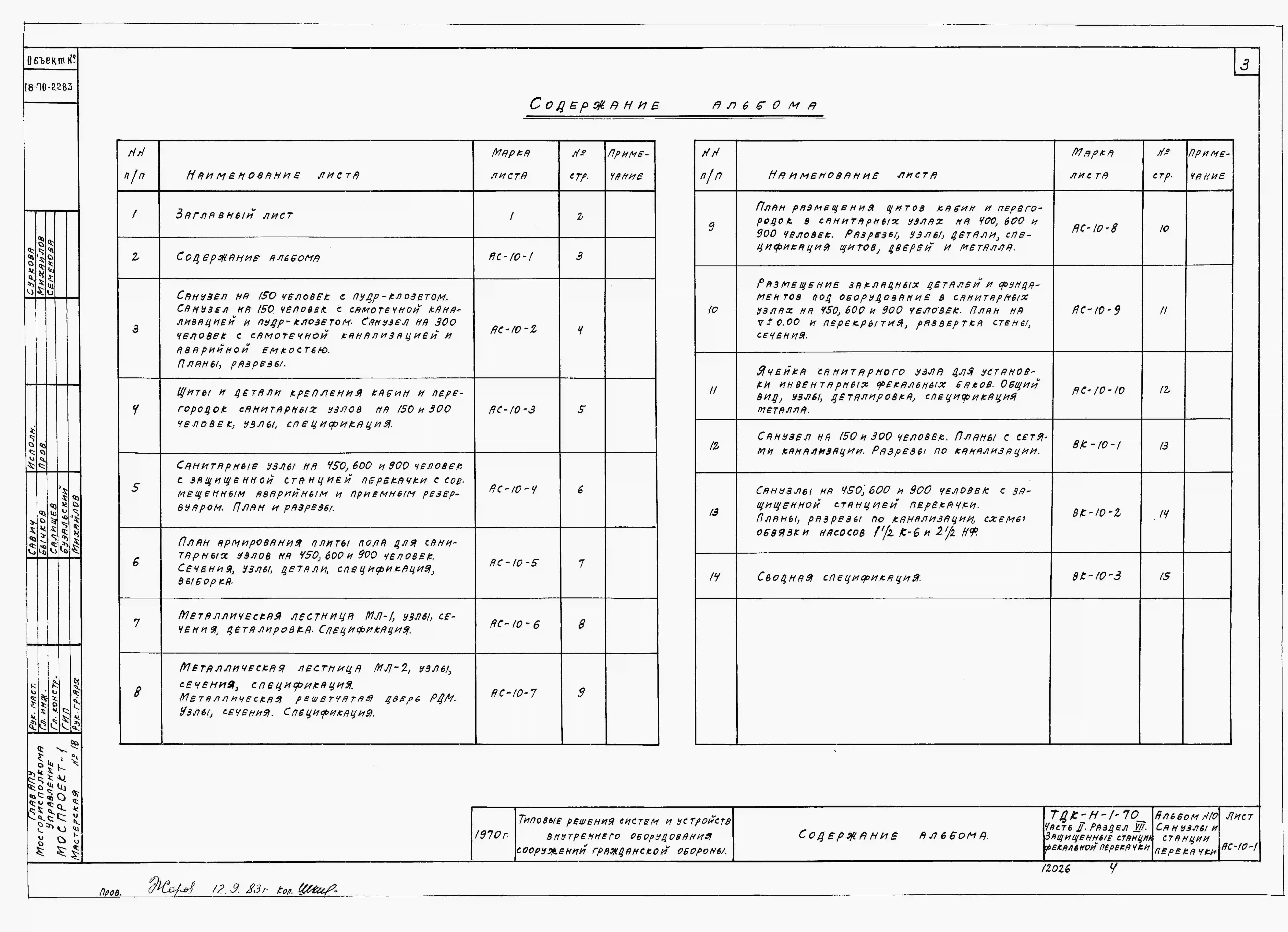 Серия ТДК-Н-1-70 Часть II Типовые решения систем и устройств внутреннего оборудования сооружений гражданской обороны: Раздел VII. Альбом 10. Санузлы и станции перекачки