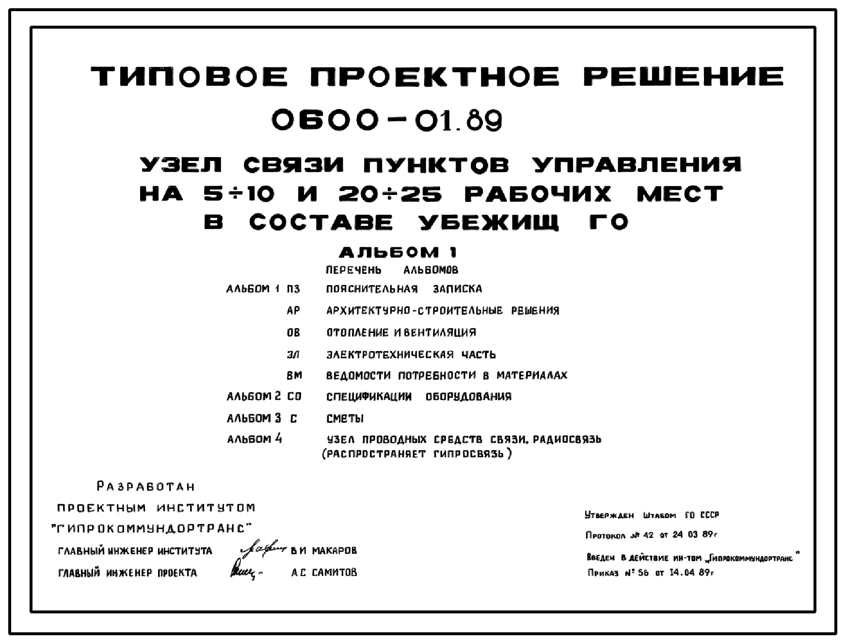 Типовой проект 0600-01.89 Узел связи пунктов управления на 5-10 и 20-25 рабочих мест в составе убежищ ГО