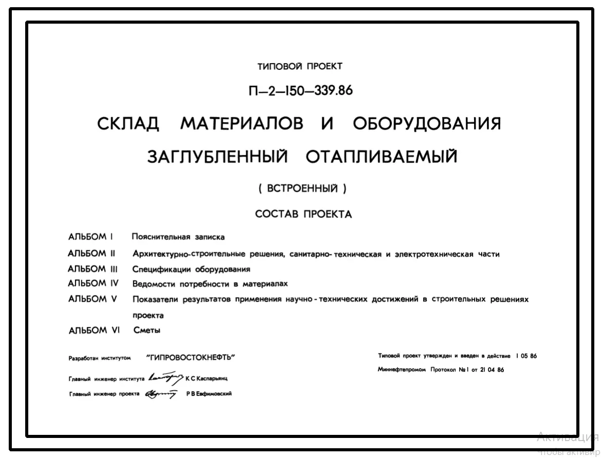 Типовой проект П-2-150-339.86 Склад материалов и оборудования заглубленный отапливаемый встроенный (убежище на 150 человек, размеры убежища 12м на 12м, режимы вентиляции 1,2,3).