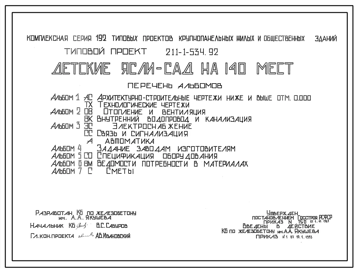 Типовой проект 211-1-534.92 Детские ясли-сад на 140 мест. Здание двухэтажное. Стены из трехслойных керамзитобетонных панелей.