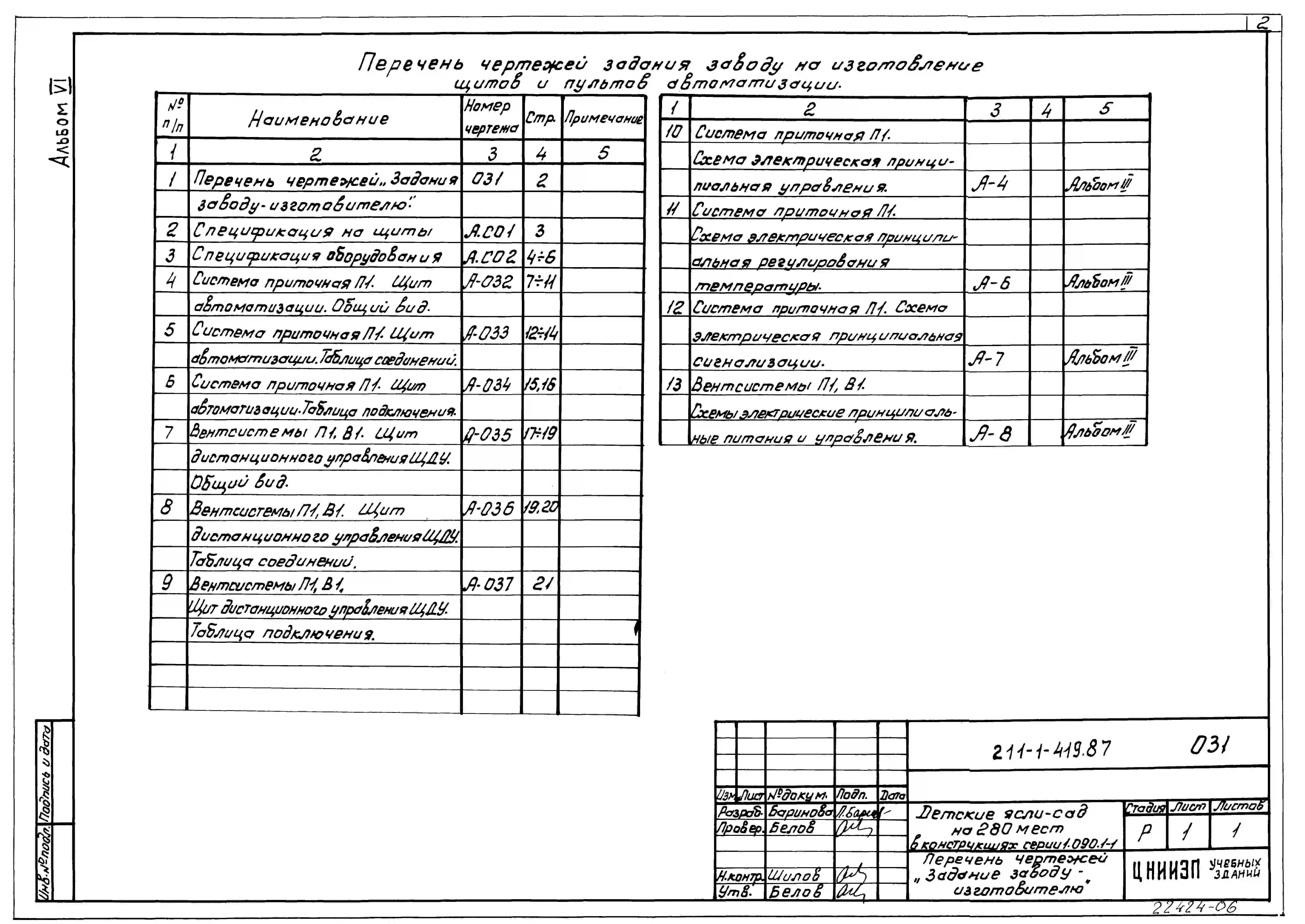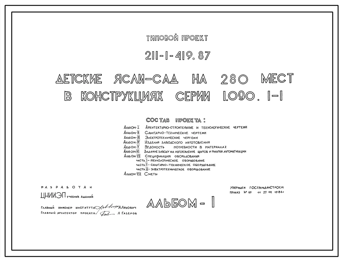 Типовой проект 211-1-419.87 Детские ясли–сад на 280 мест. Здание двухэтажное. Стены из трехслойных легкобетонных панелей по серии 1.090.1-1.