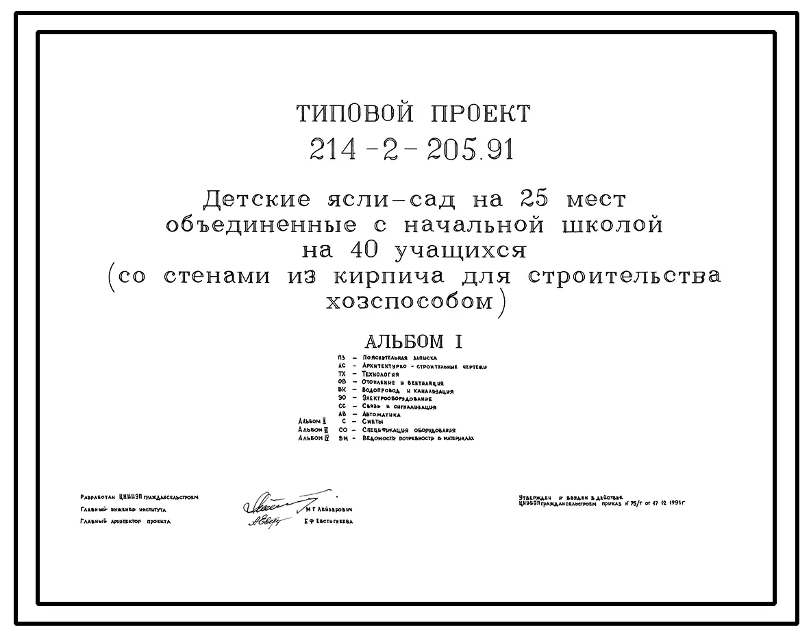 Типовой проект 214-2-205.91 Детские ясли–сад на 25 мест, объединенные с начальной школой на 40 учащихся (со стенами из кирпича, для строительства хозспособом). Здание одноэтажное.