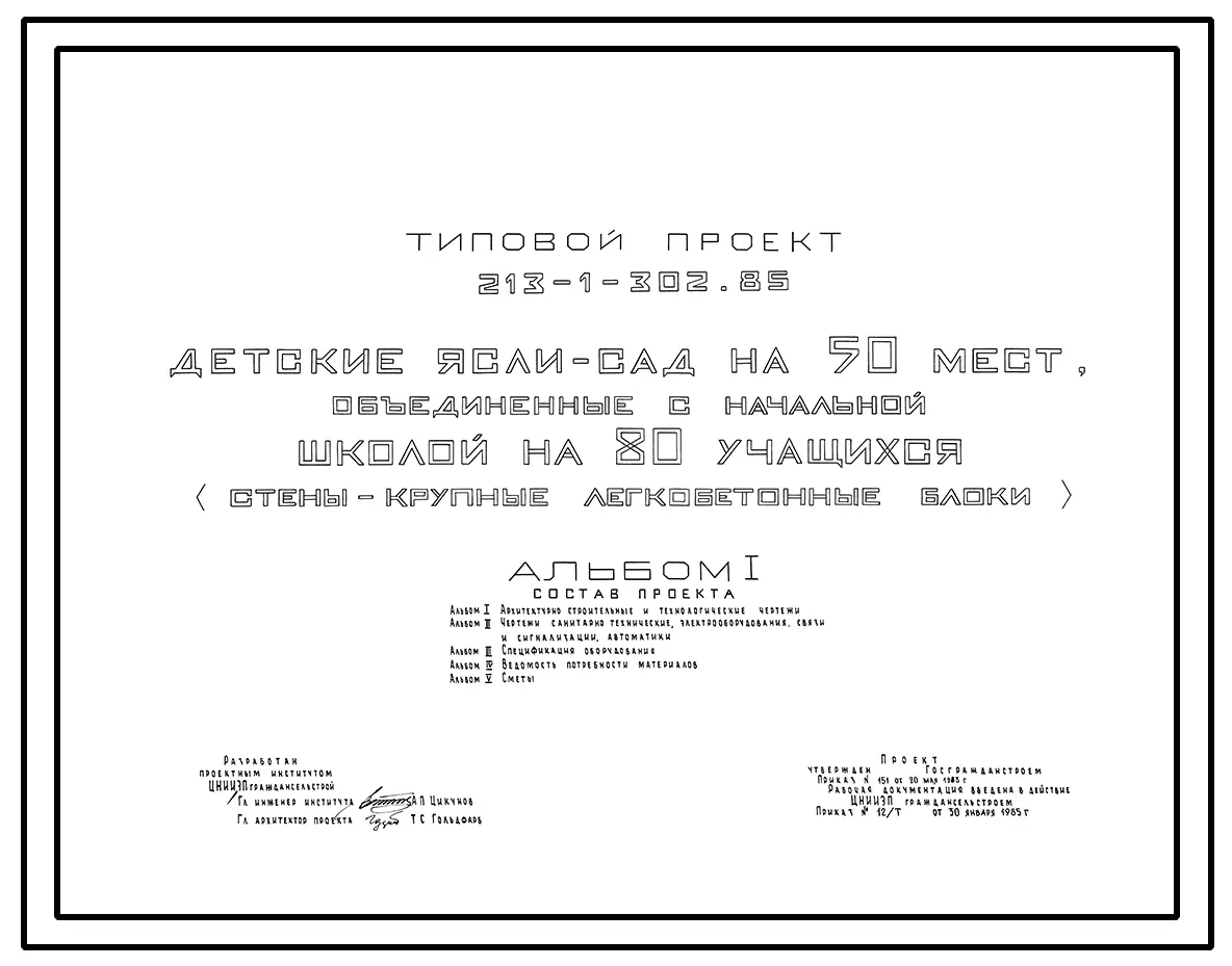 Типовой проект 213-1-302.85 Детские ясли–сад на 50 мест, объединенные с начальной школой на 80 учащихся. Здание одноэтажное. Стены из крупных легкобетонных блоков.
