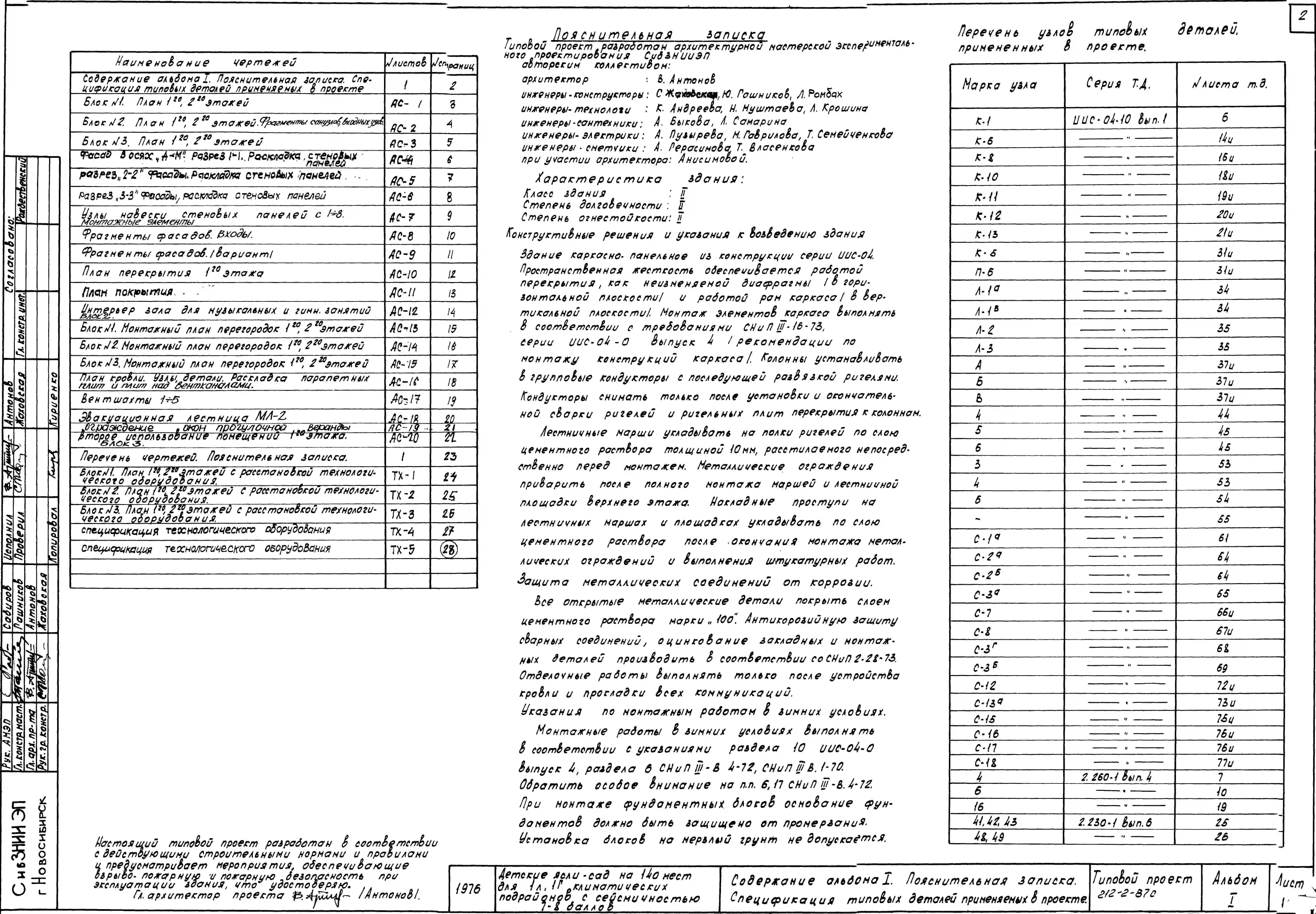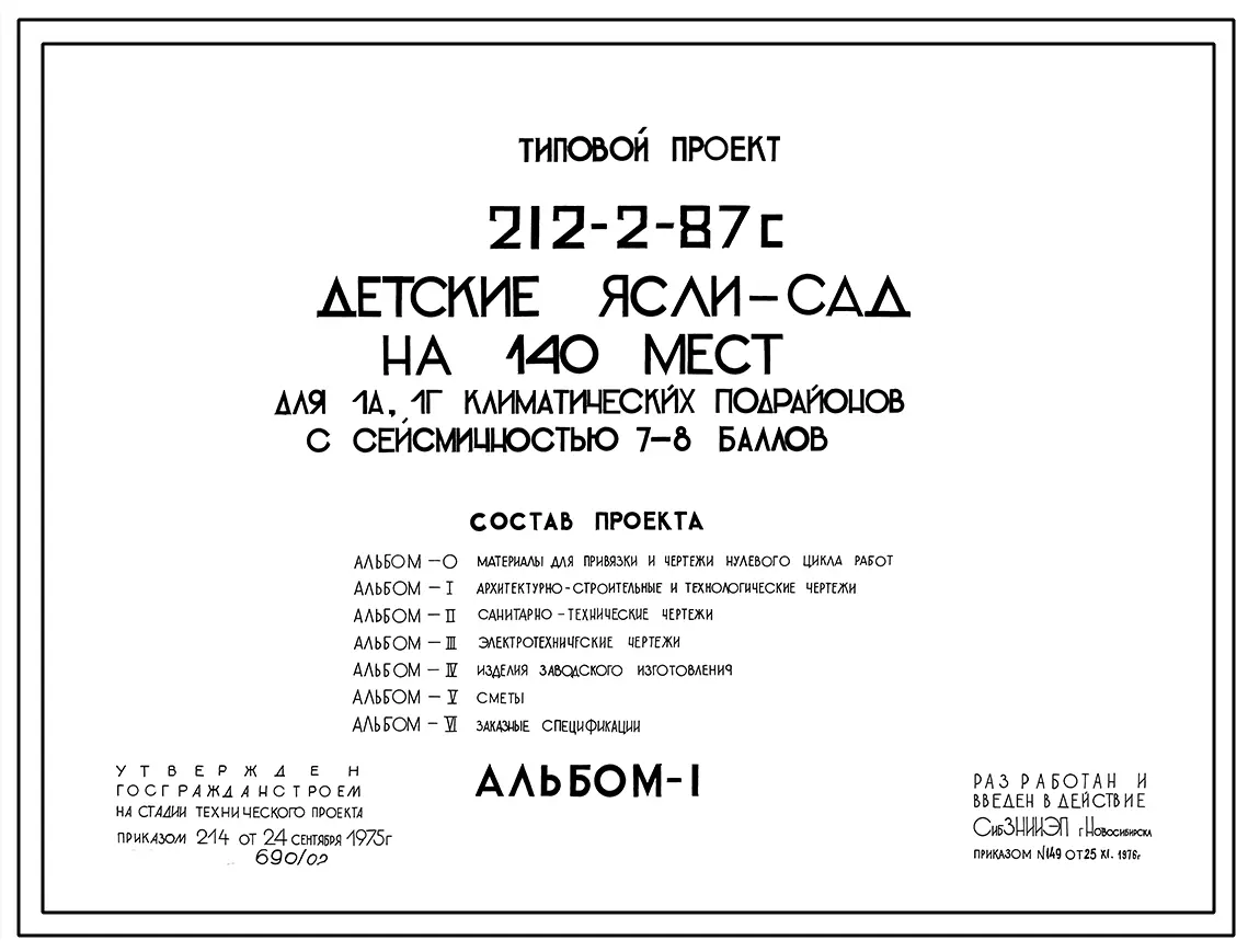 Типовой проект 212-2-87с Детские ясли-сад на 140 мест для IА, IГ климатических подрайонов с сейсмичностью 7 и 8 баллов в конструкциях ИИС-04.