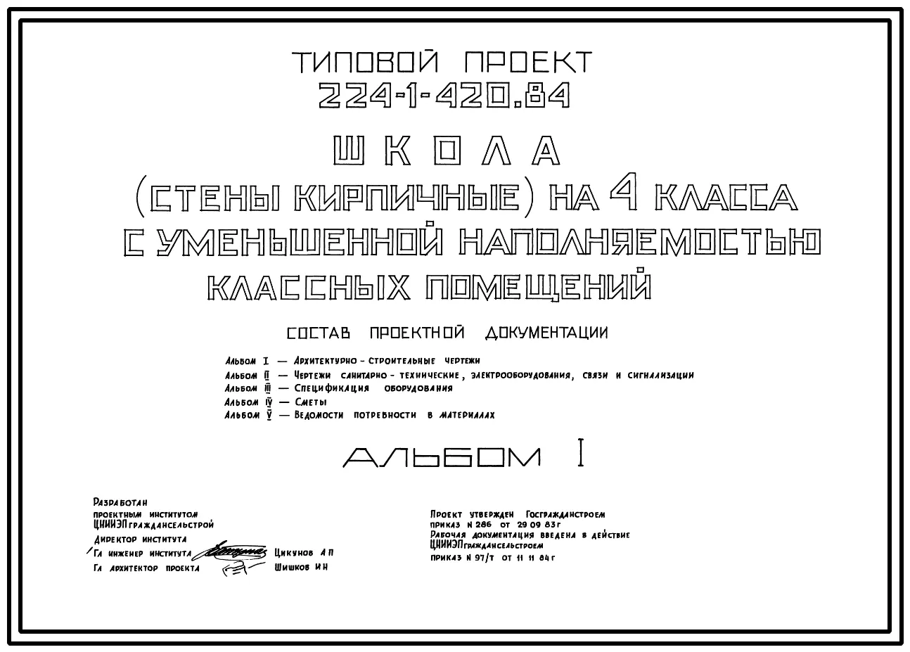 Типовой проект 224-1-420.84 Школа на 4 класса с уменьшенной наполняемостью классных помещений. Здание одноэтажное. Стены из кирпича.