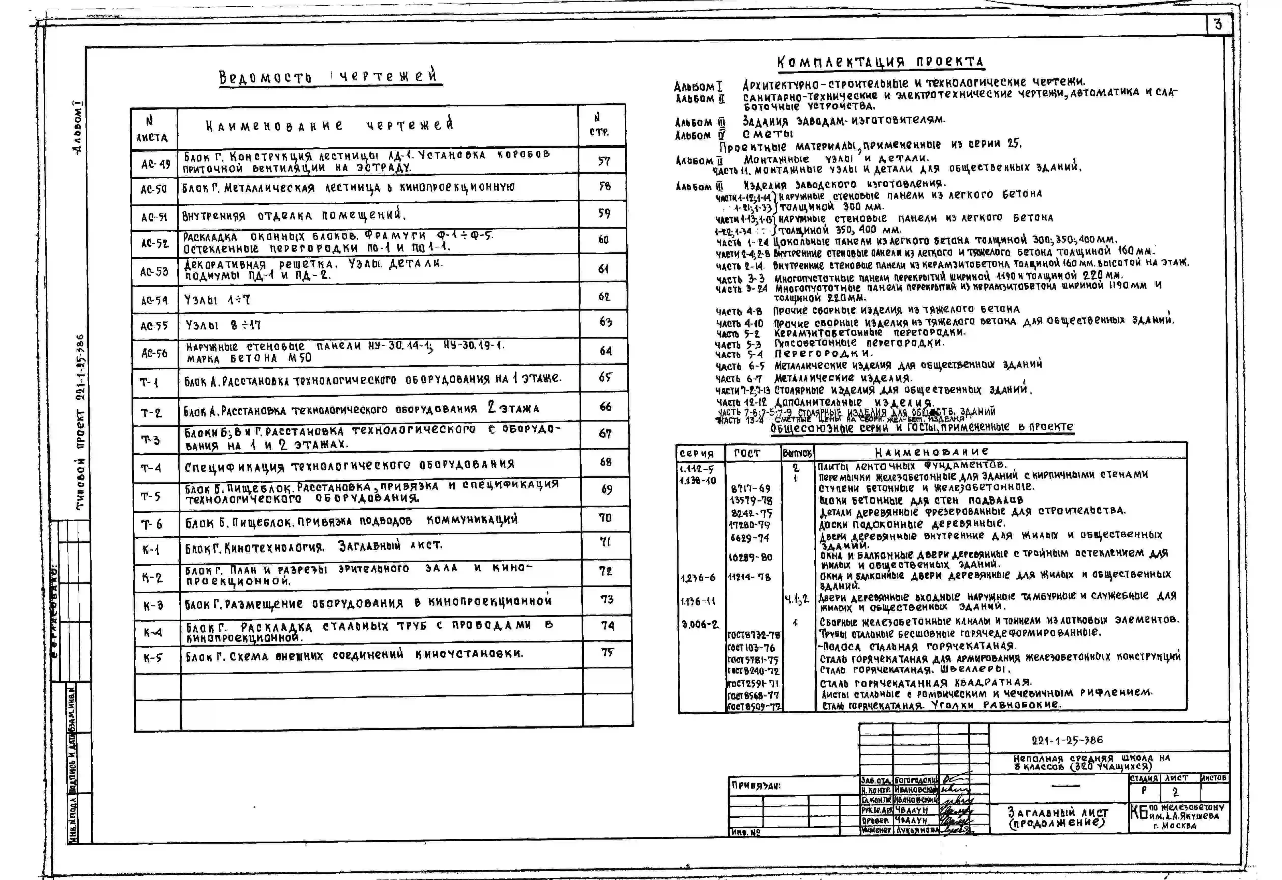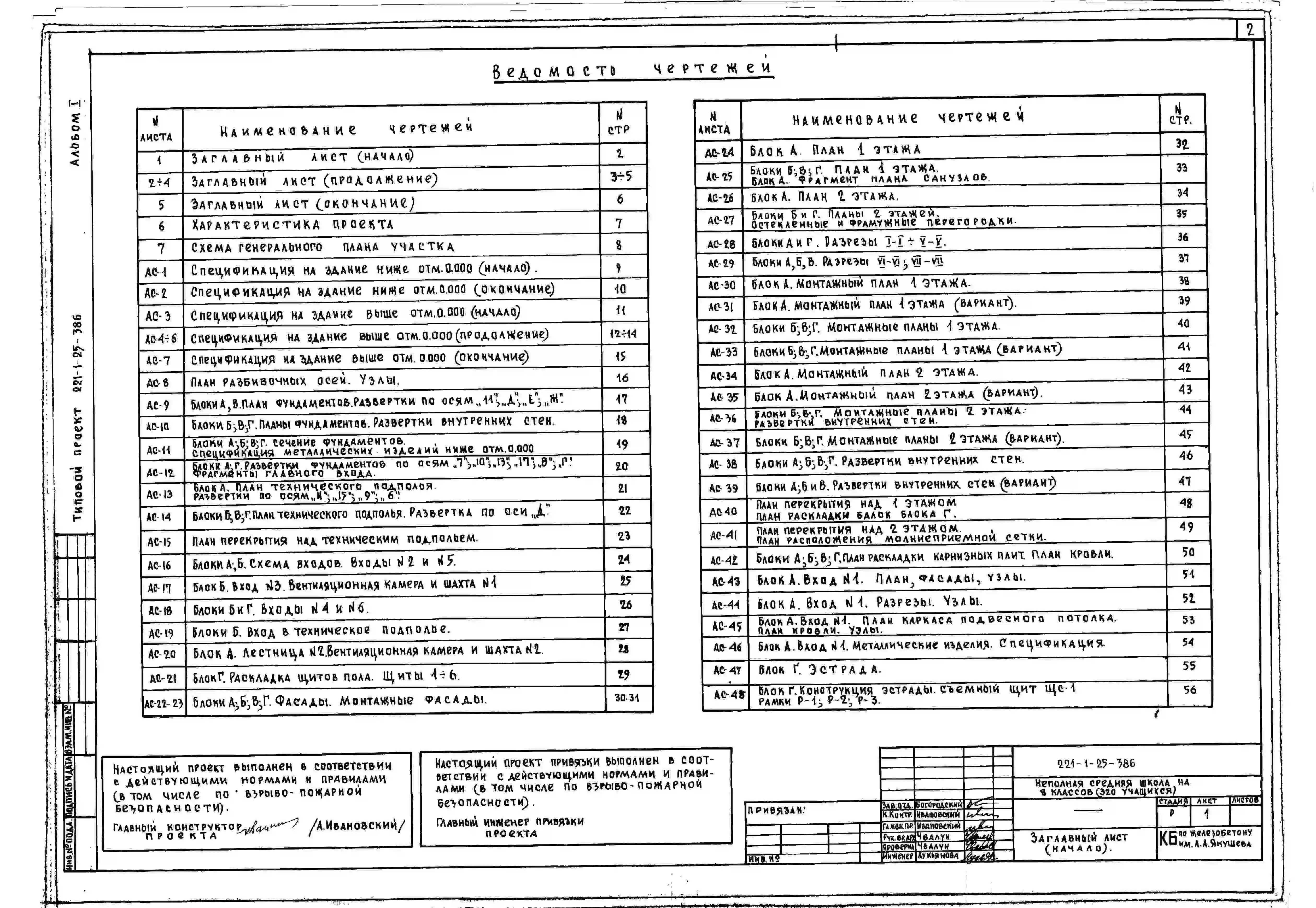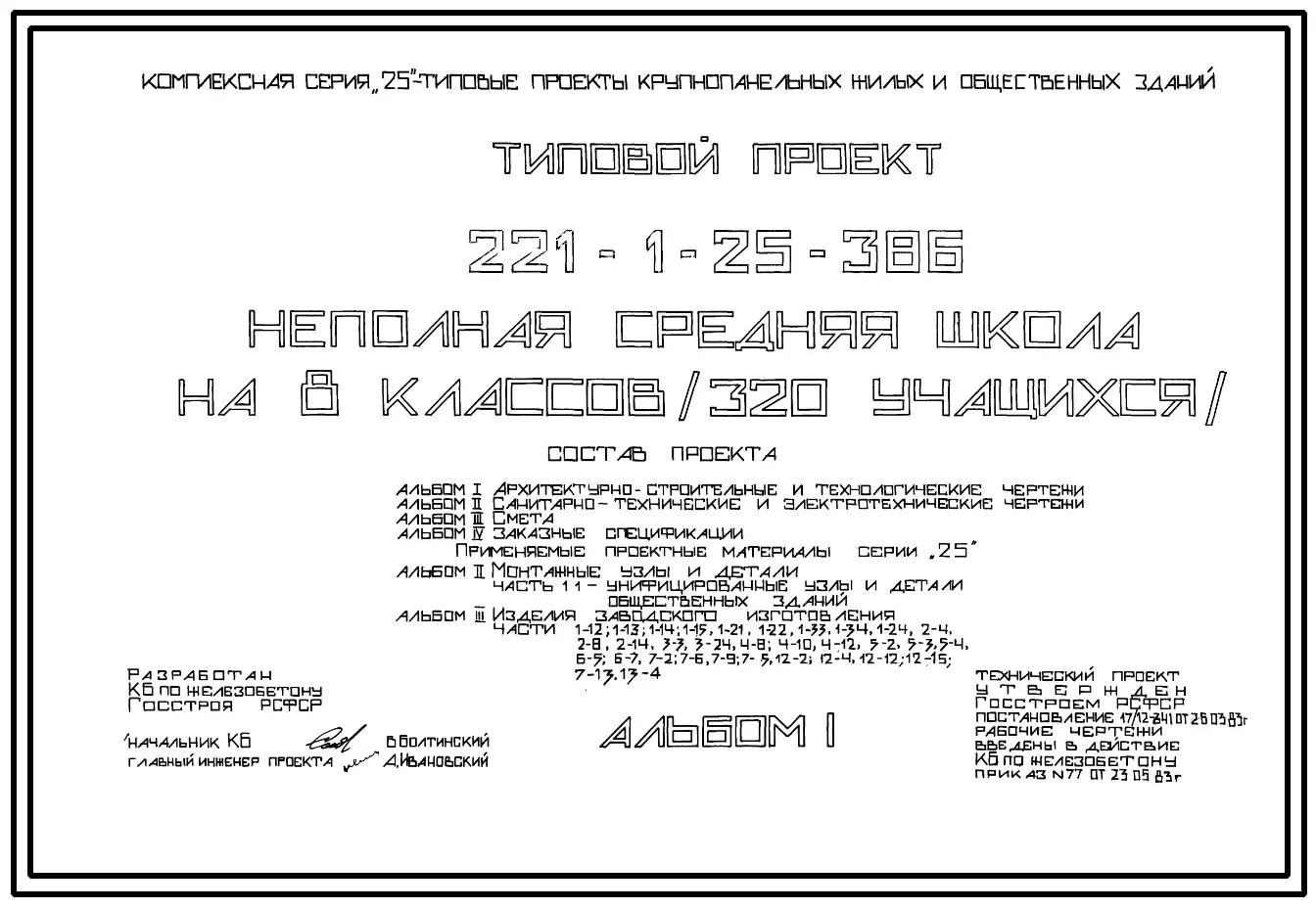 Типовой проект 221-1-25-386 Неполная средняя школа на 8 классов (320 учащихся). Здание двухэтажное в конструкции серии 25. Стены из однослойных легкобетонных панелей.