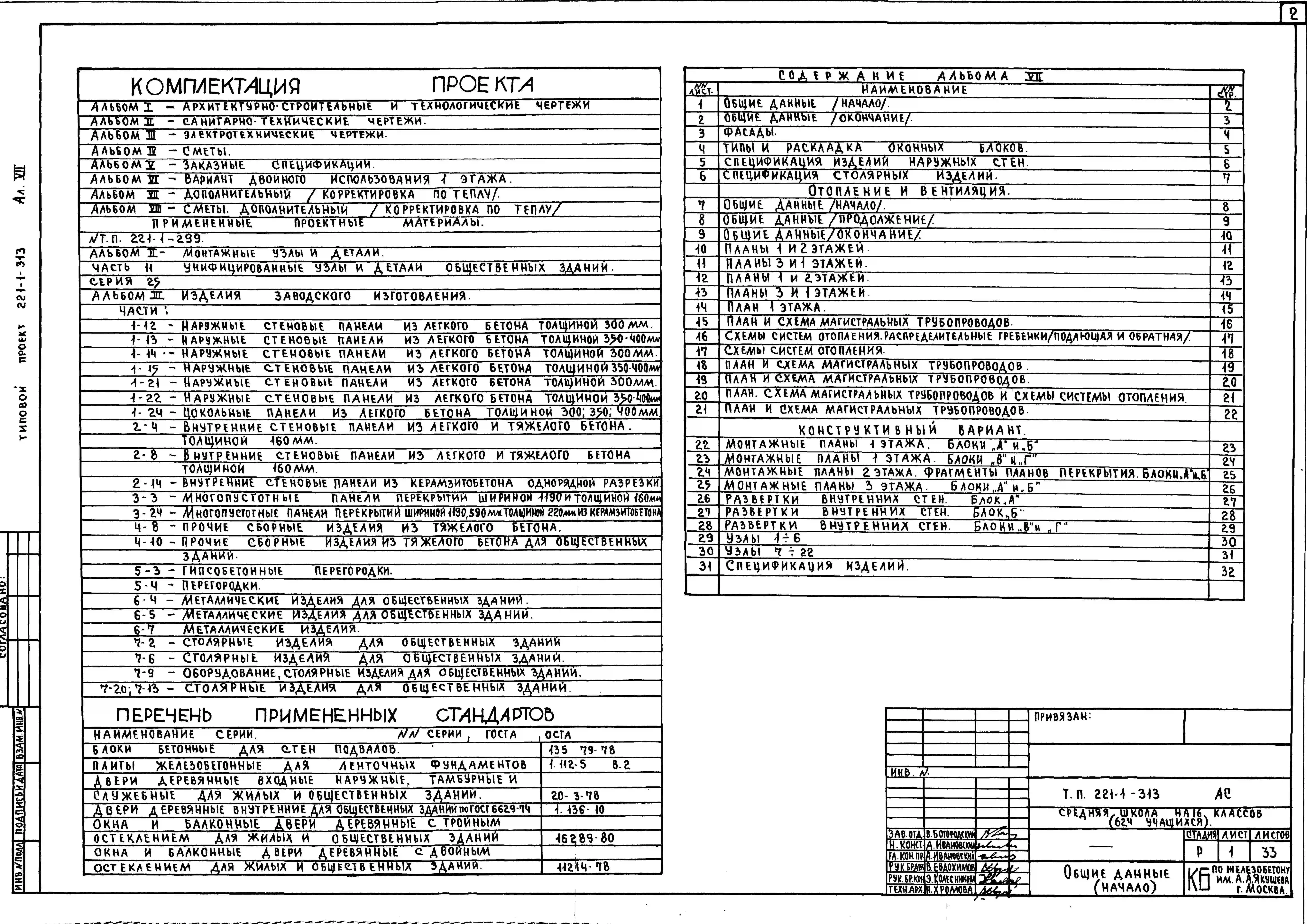 Типовой проект 221-1-313 Средняя школа на 16 классов (624 учащихся). Здание одно-, двух-, трехэтажное. Конструкции серии 25. Стены из однослойных легкобетонных панелей.