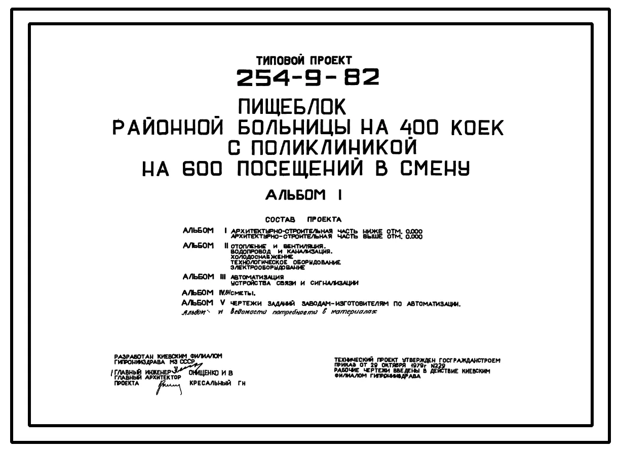Типовой проект 254-9-82 Пищеблок районной больницы на 400 коек с поликлиникой на 600 посещений в смену. Здание одно-, двухэтажное. Стены из кирпича.