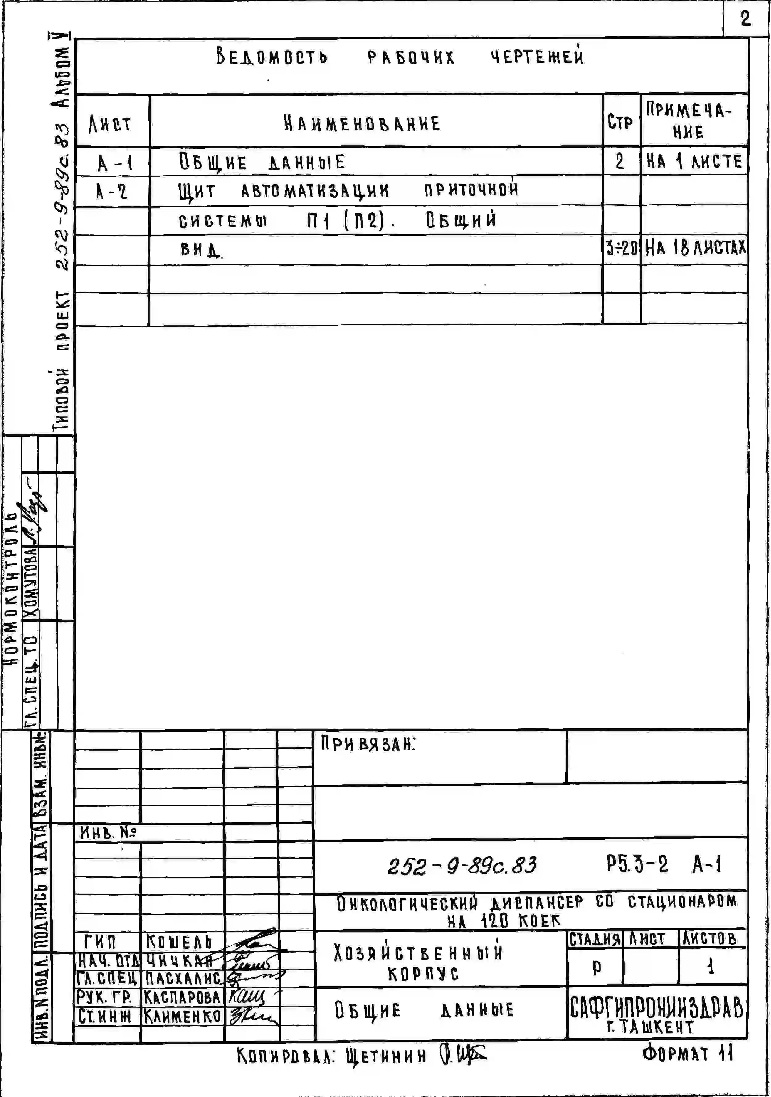 Типовой проект 252-9-89с.83 Хозяйственный корпус онкологического диспансера со стационаром на 120 коек. Сейсмичность 7, 8, 9 баллов. Здание одно -, двухэтажное. Каркас сборный железобетонный серии ИИС-04. Стены из легкобетонных панелей.
