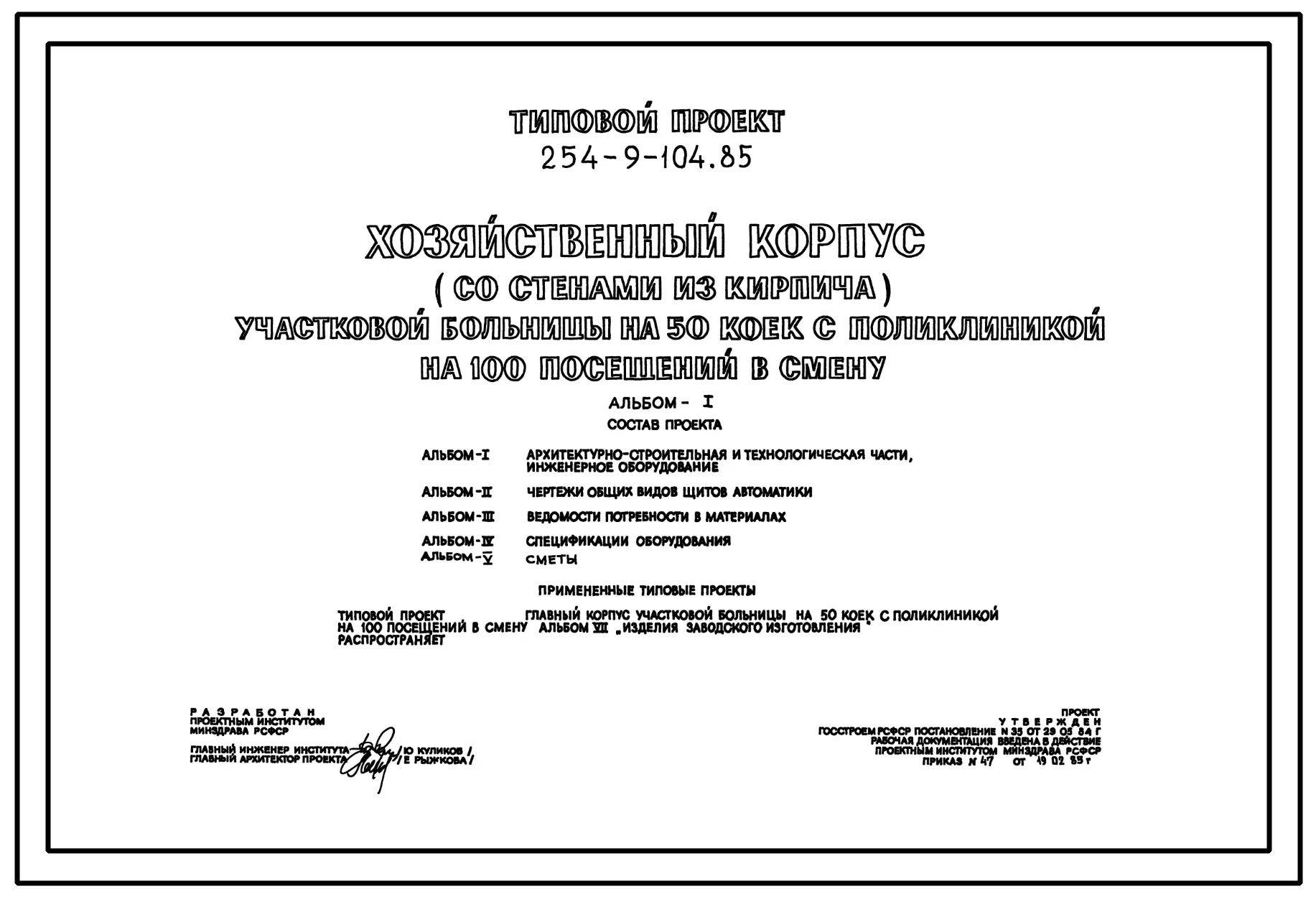 Типовой проект 254-9-104.85 Хозяйственный корпус участковой больницы на 50 коек с поликлиникой на 100 посещений в смену. Здание одноэтажное. Стены из кирпича.