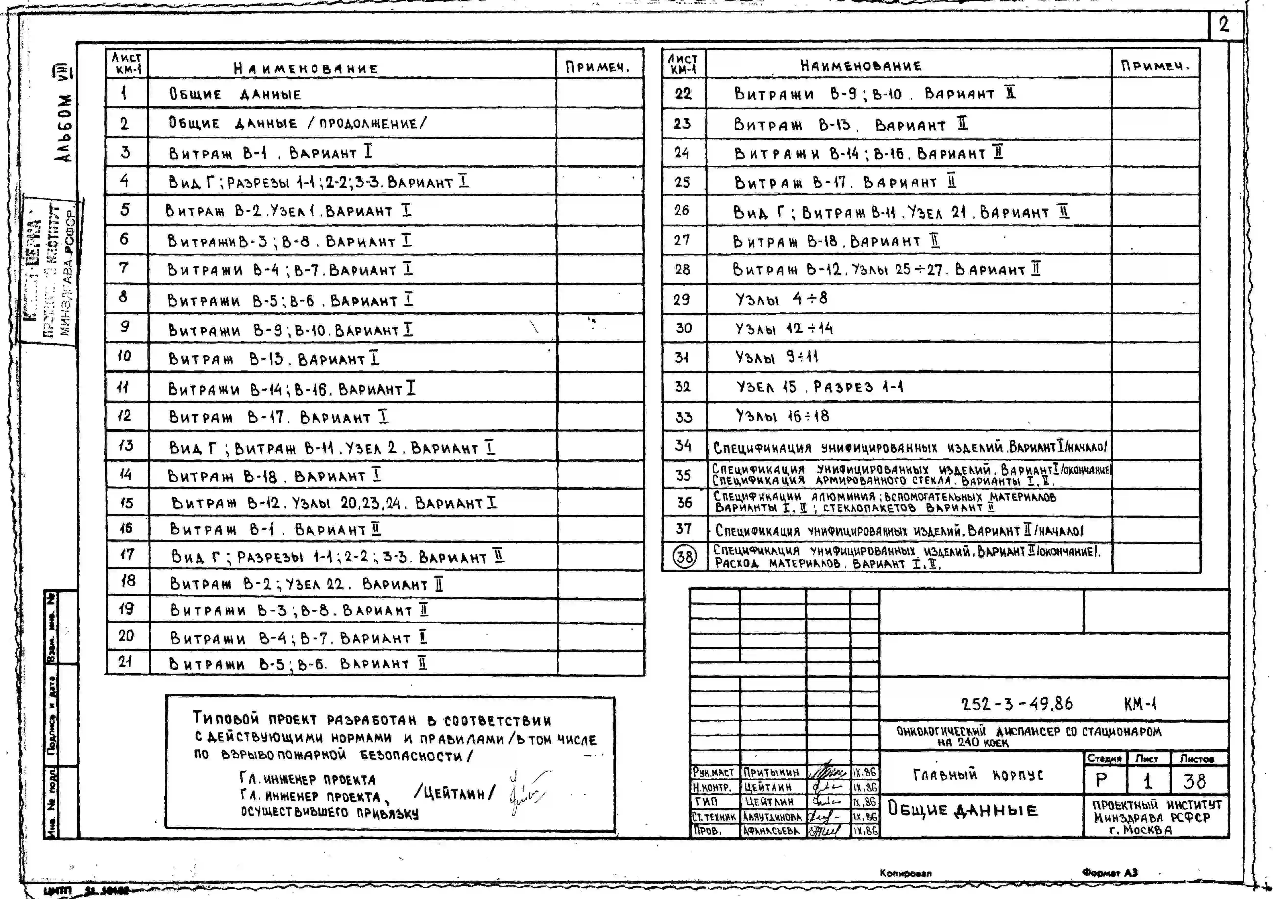Типовой проект 252-3-49.86 Главный корпус онкологического диспансера со стационаром на 240 коек. Здание шестиэтажное. Каркас по серии 1.020-1/83. Стены из легкобетонных панелей.