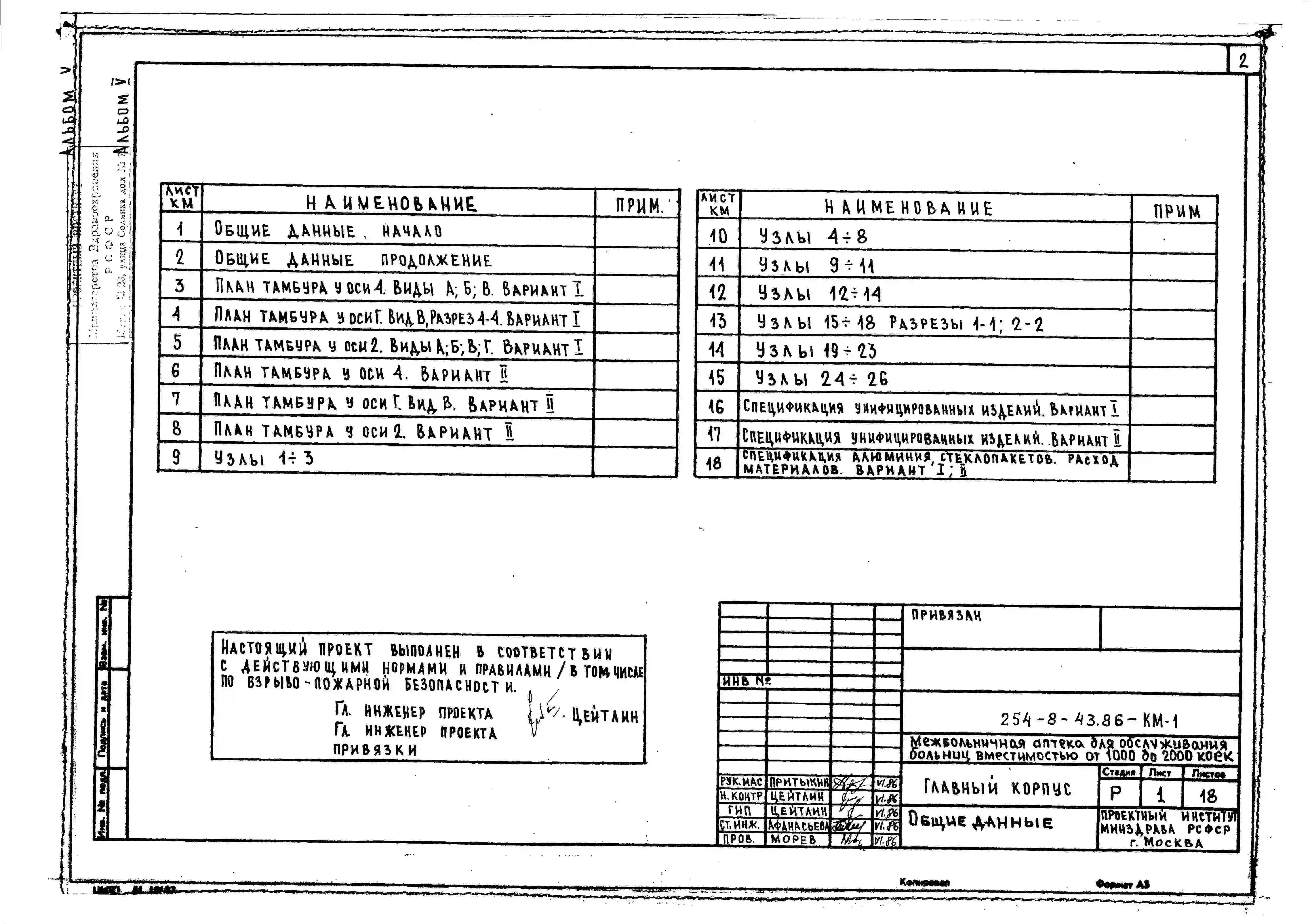 Типовой проект 254-8-43.86 Главный корпус межбольничной аптеки для обслуживания больниц вместимостью от 1000 до 2000 коек. Здание четырехэтажное. Стены из кирпича.