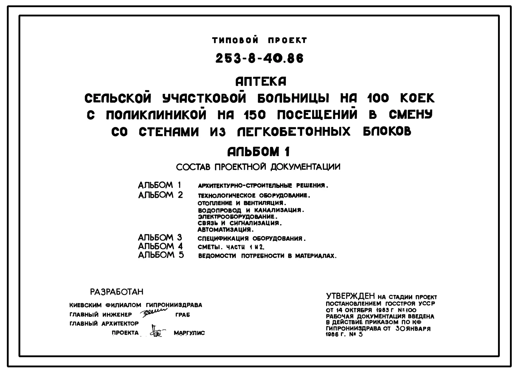 Типовой проект 253-8-40.86 Аптека сельской участковой больницы на 100 коек с поликлиникой на 150 посещений в смену со стенами из легкобетонных блоков