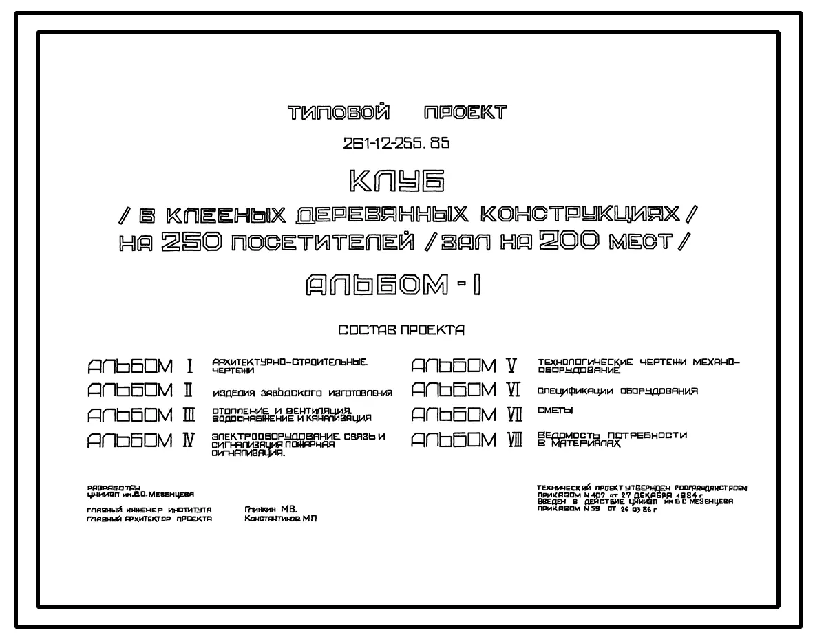 Типовой проект 261-12-255.85 Клуб (в клееных деревянных конструкциях) на 250 посетителей (зал на 200 мест). Полный исходный проект.