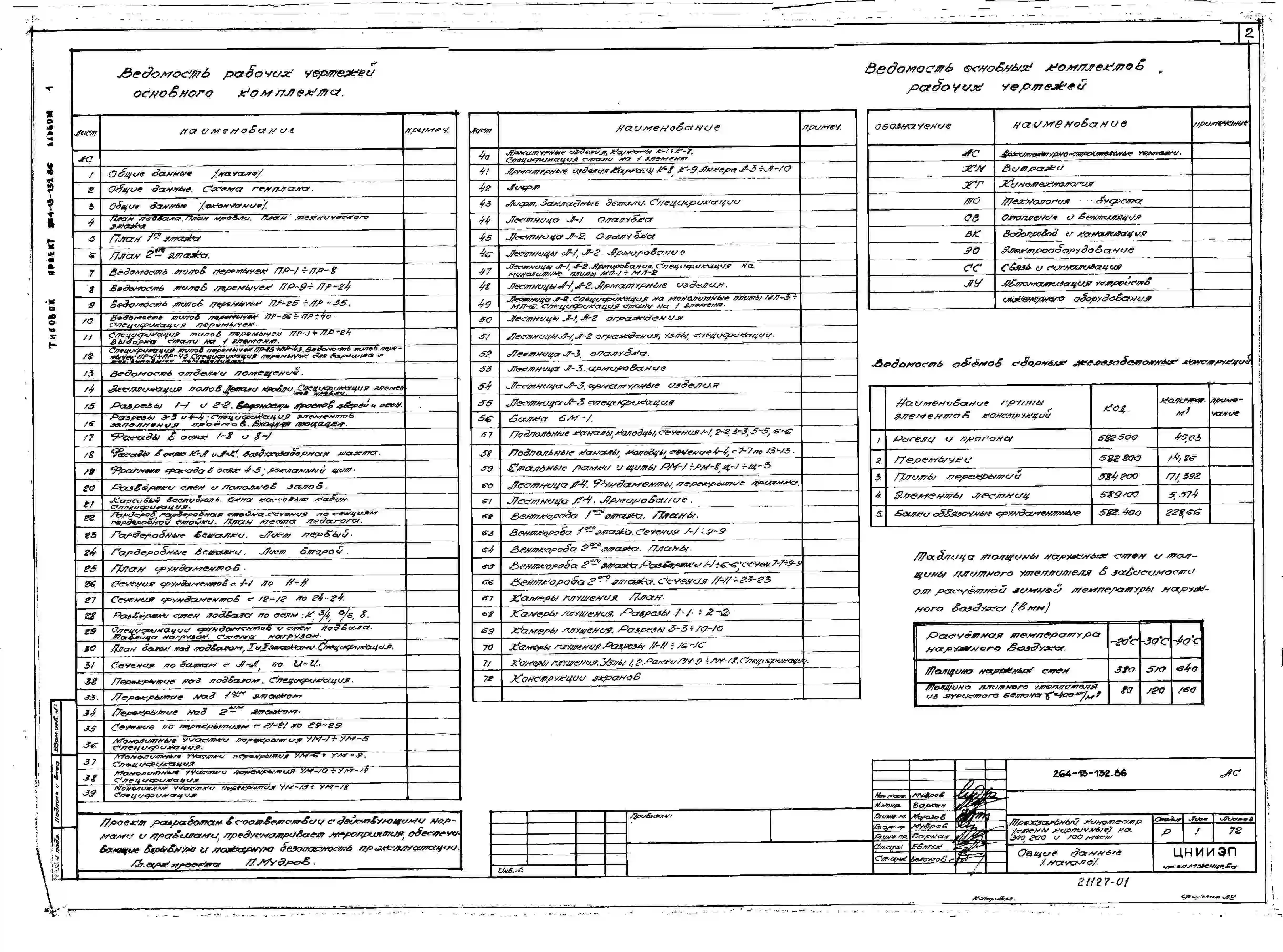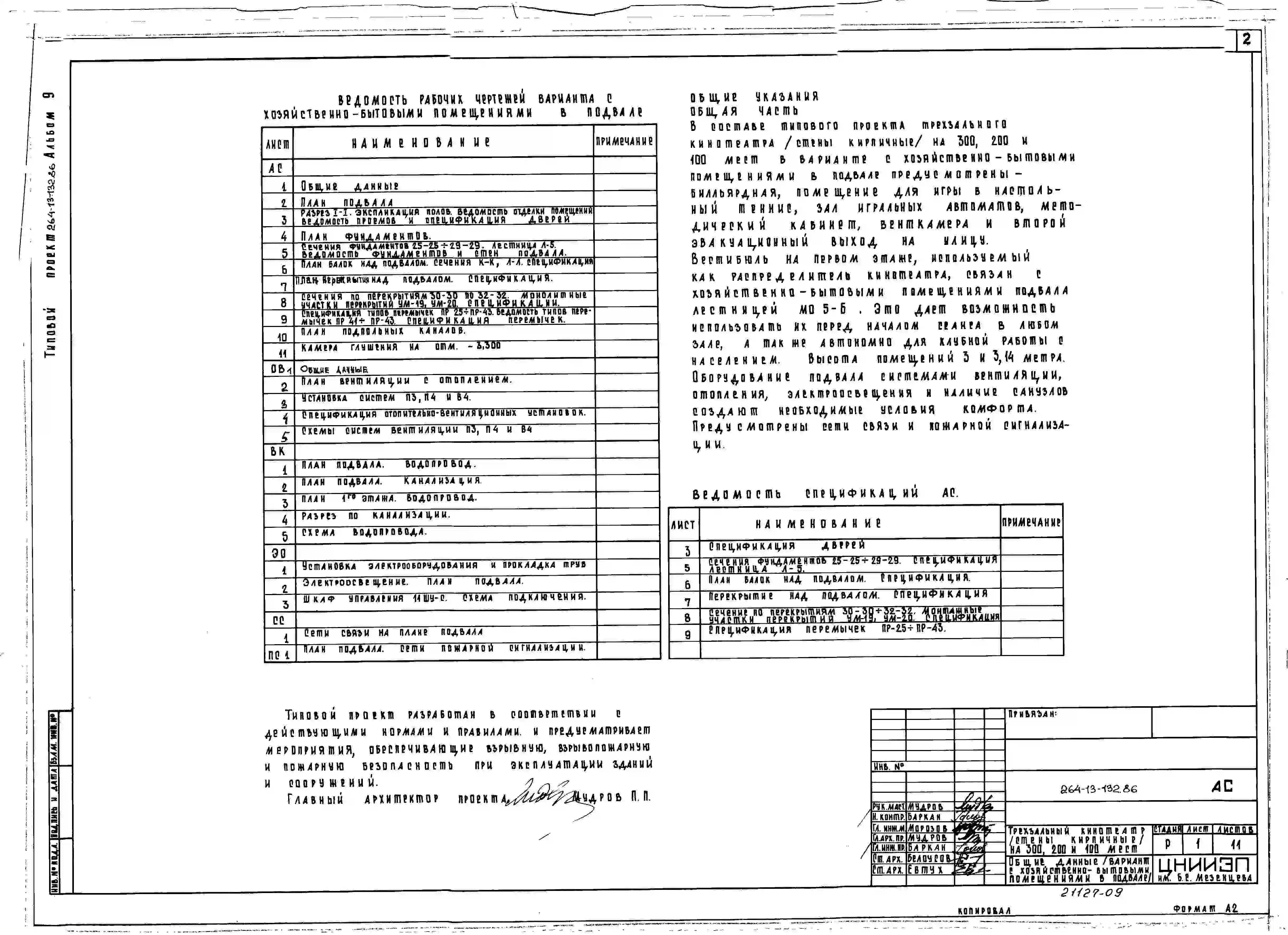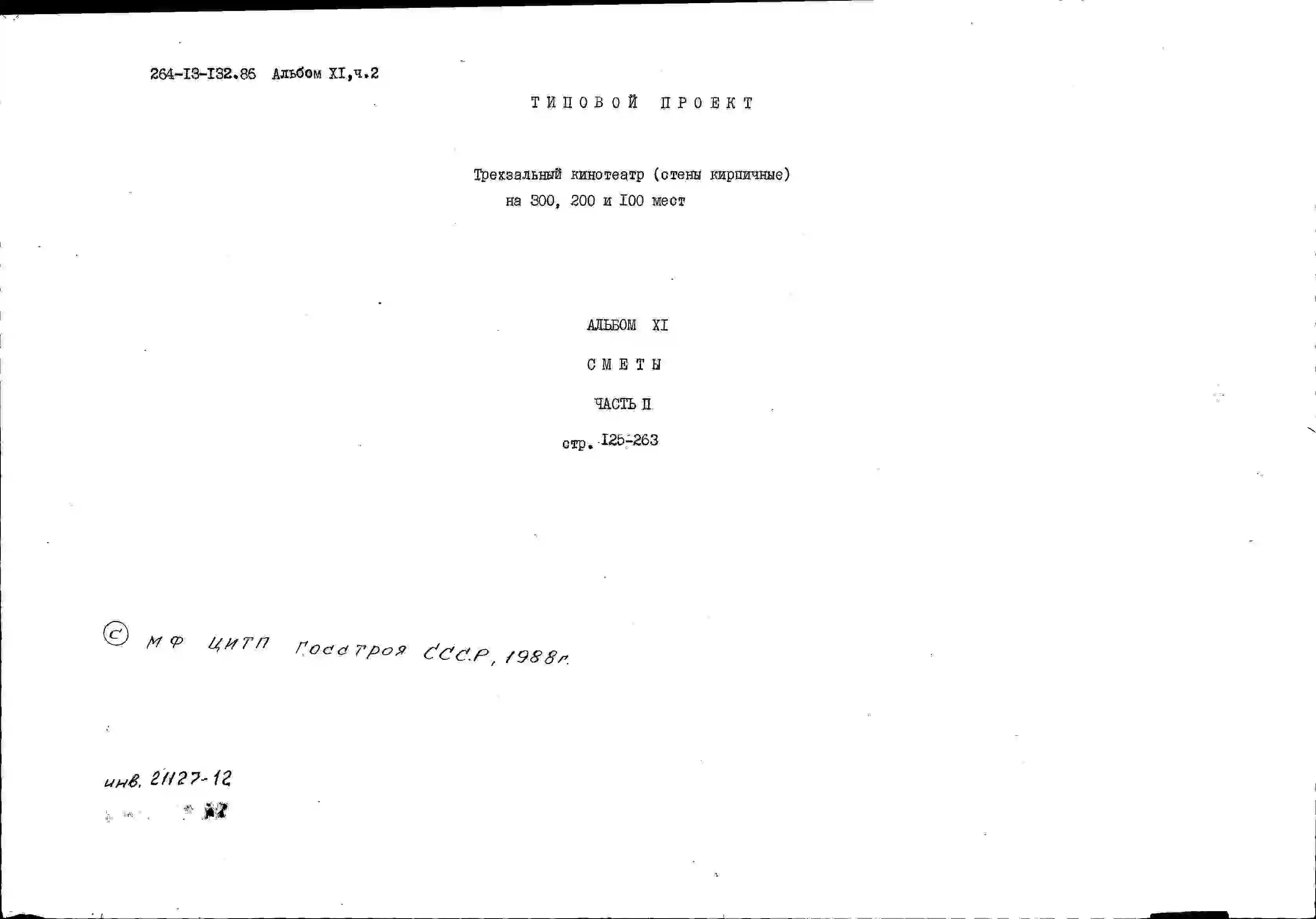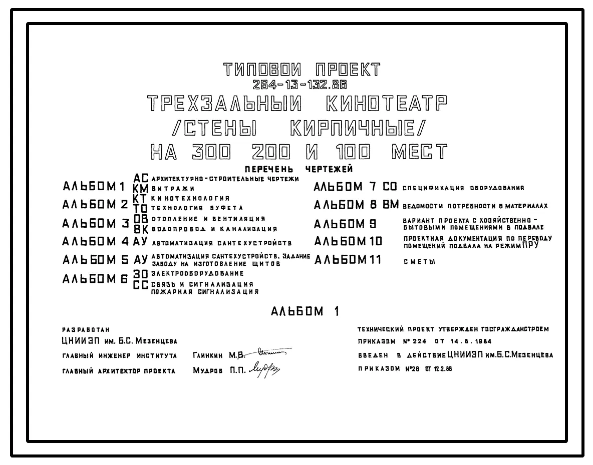 Типовой проект 264-13-132.86 Трехзальный кинотеатр на 300, 200 и 100 мест. Стены кирпичные