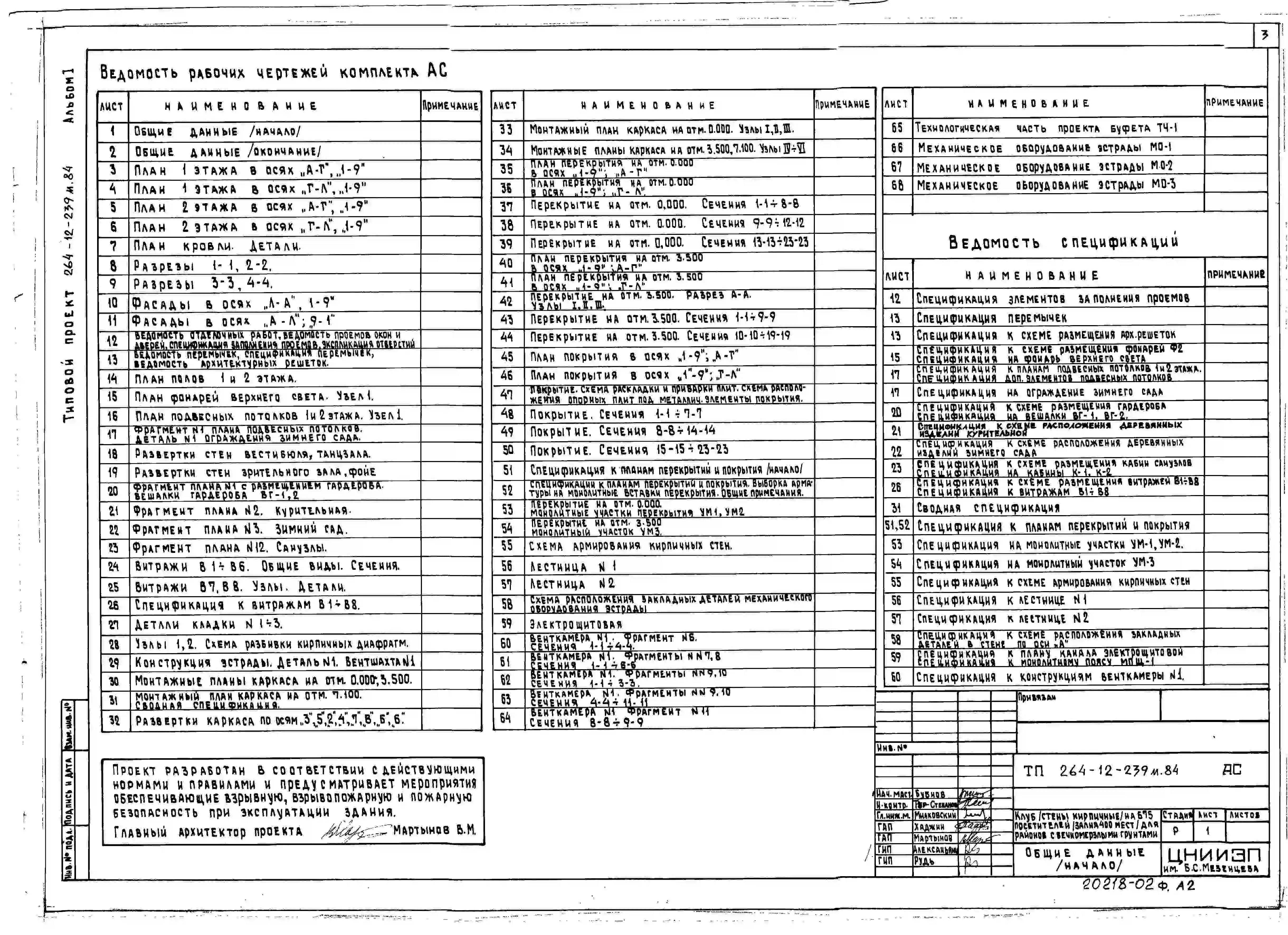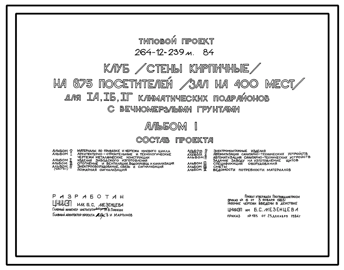 Типовой проект 264-12-239м.84 Клуб на 675 посетителей (зал на 400 мест). Для строительства в 1А, 1Б, 1Г климатических подрайонах на вечномерзлых грунтах, используемых по принципу 1