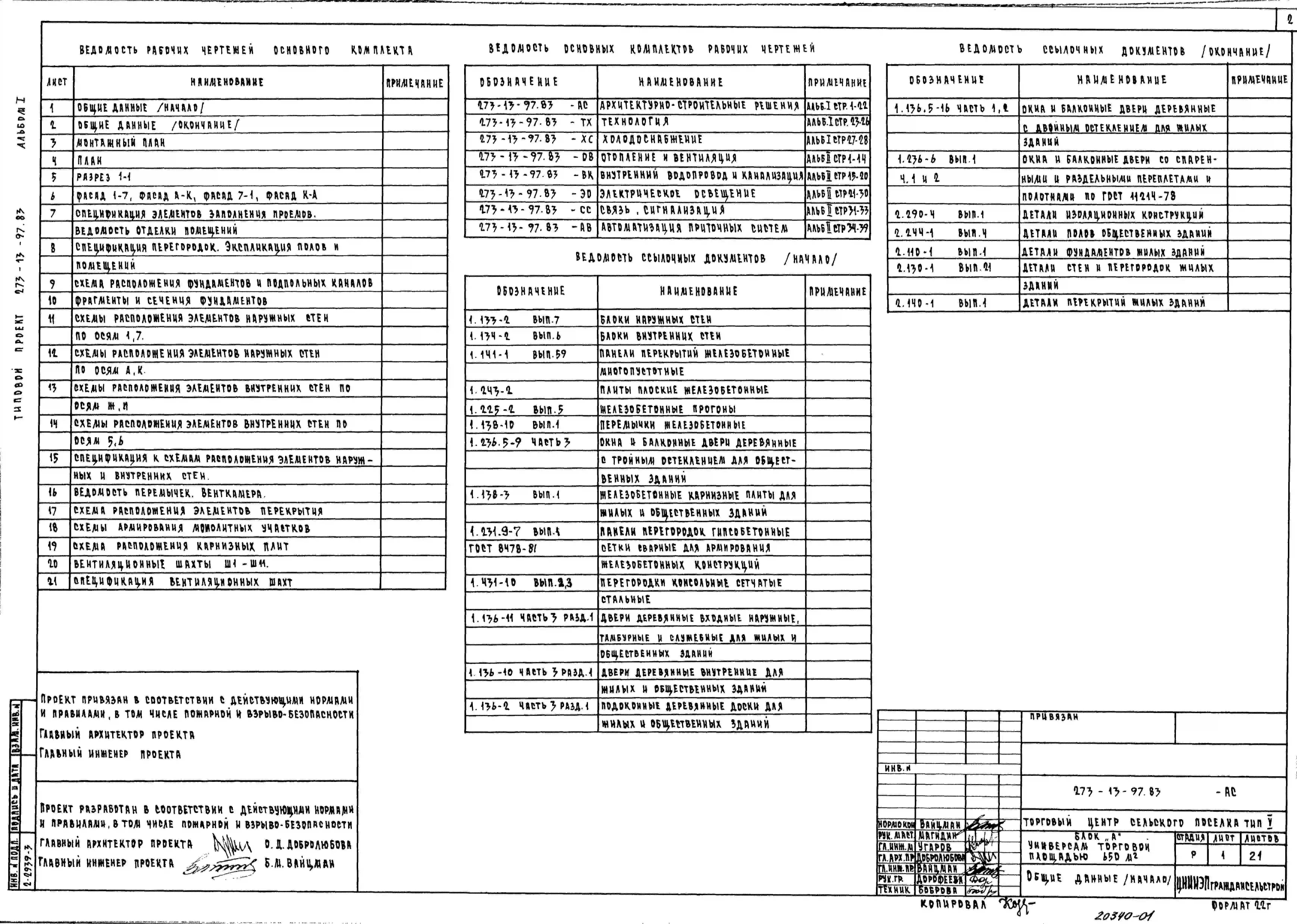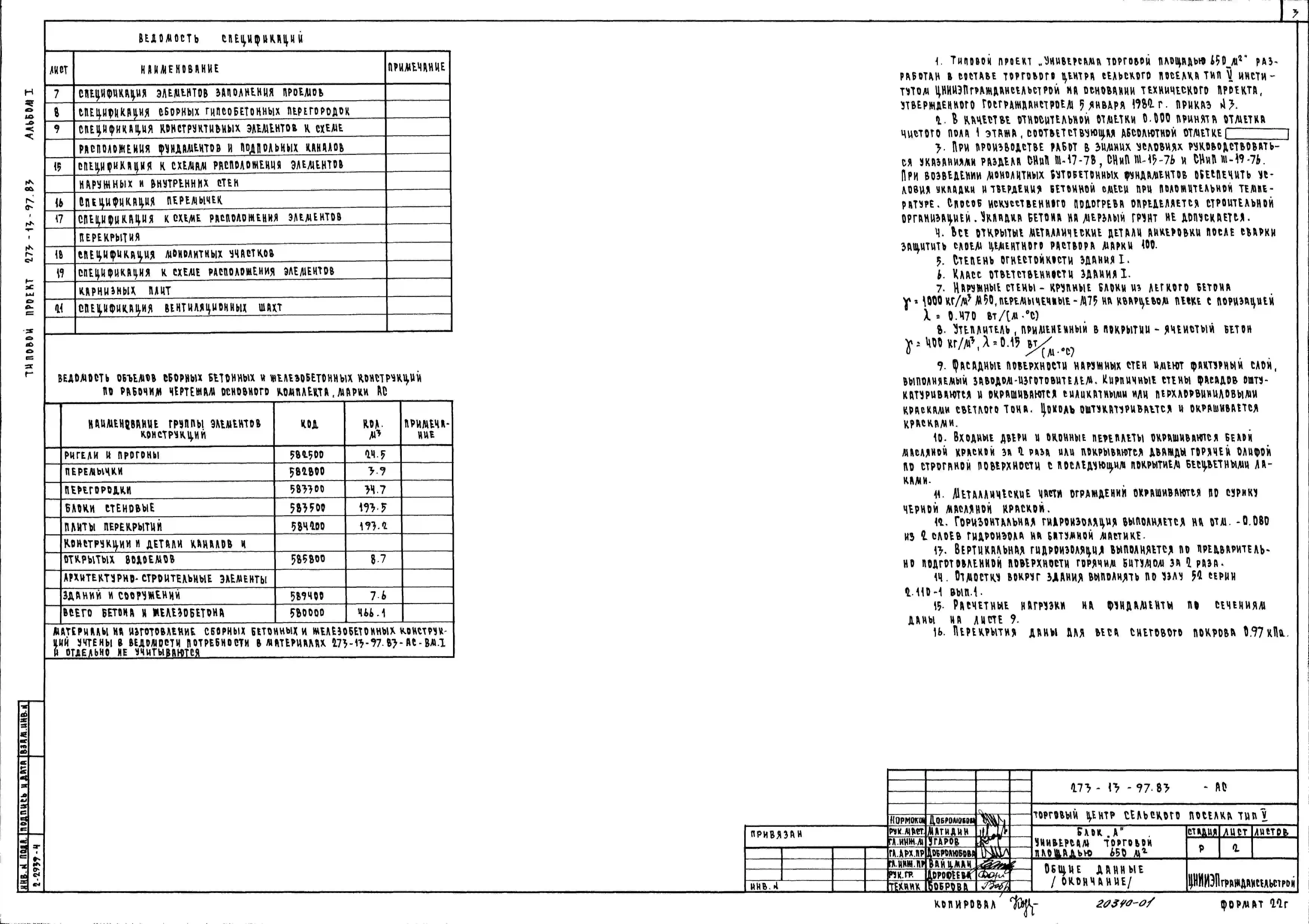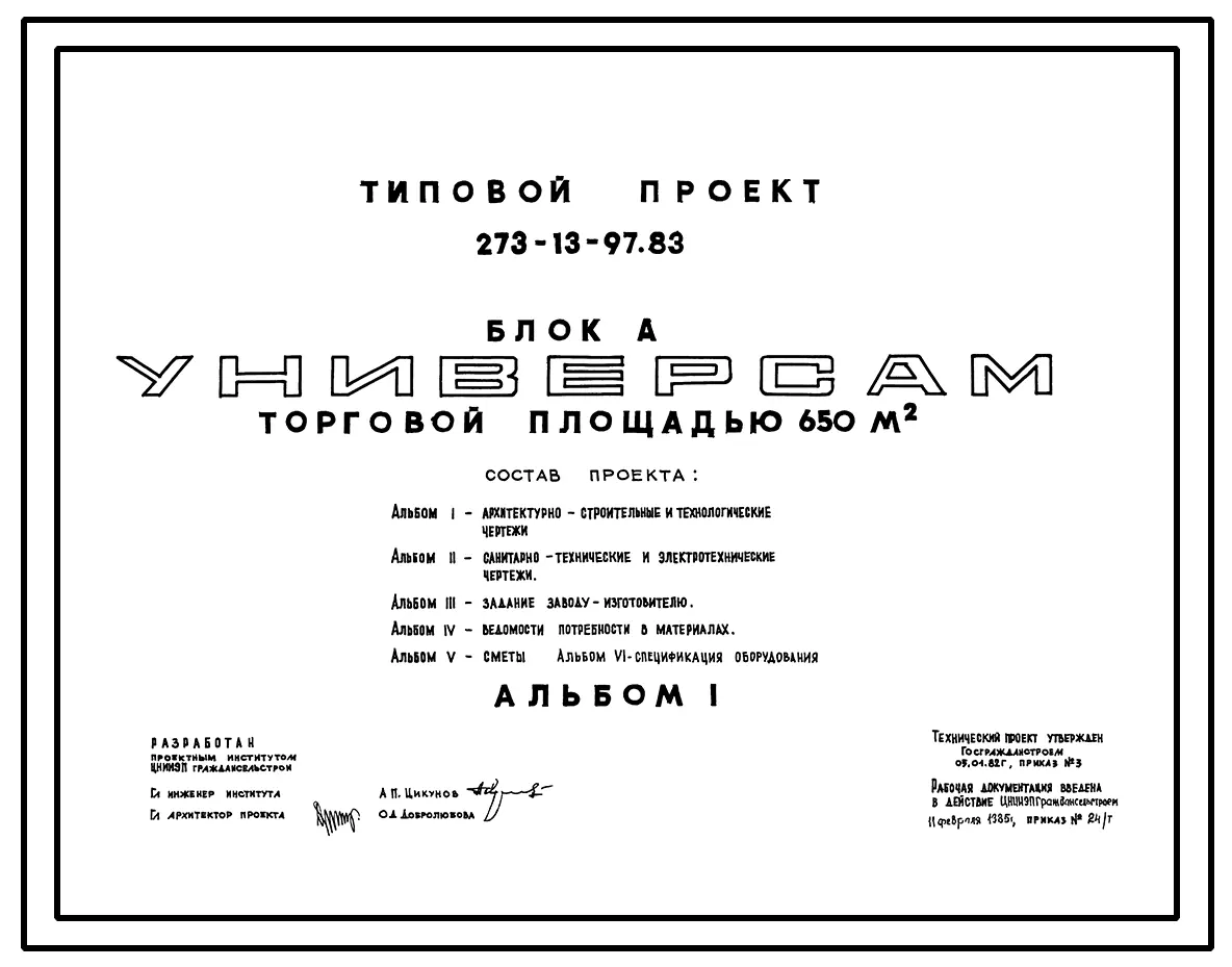 Типовой проект 273-13-97.83 Универсам торговой площадью 650 м2. Торговый центр поселка. Для строительства в 1В климатическом подрайоне, 2 и 3 климатических районах. Блок А
