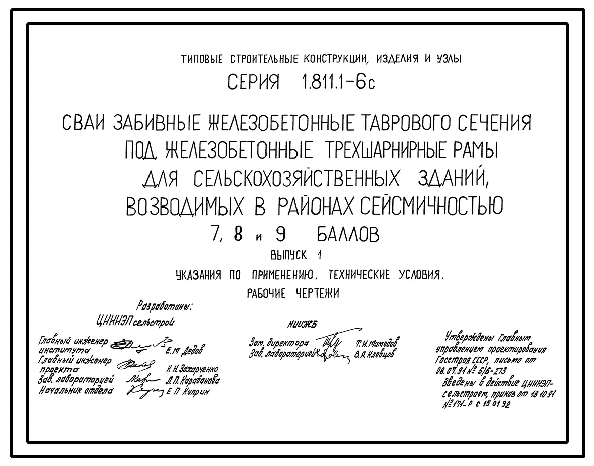 Серия 1.811.1-6с Сваи забивные железобетонные таврового сечения под железобетонные трехшарнирные рамы для сельскохозяйственных зданий, возводимых в районах сейсмичностью 7, 8, 9 баллов. Указания по применению. Технические условия. Рабочие чертежи