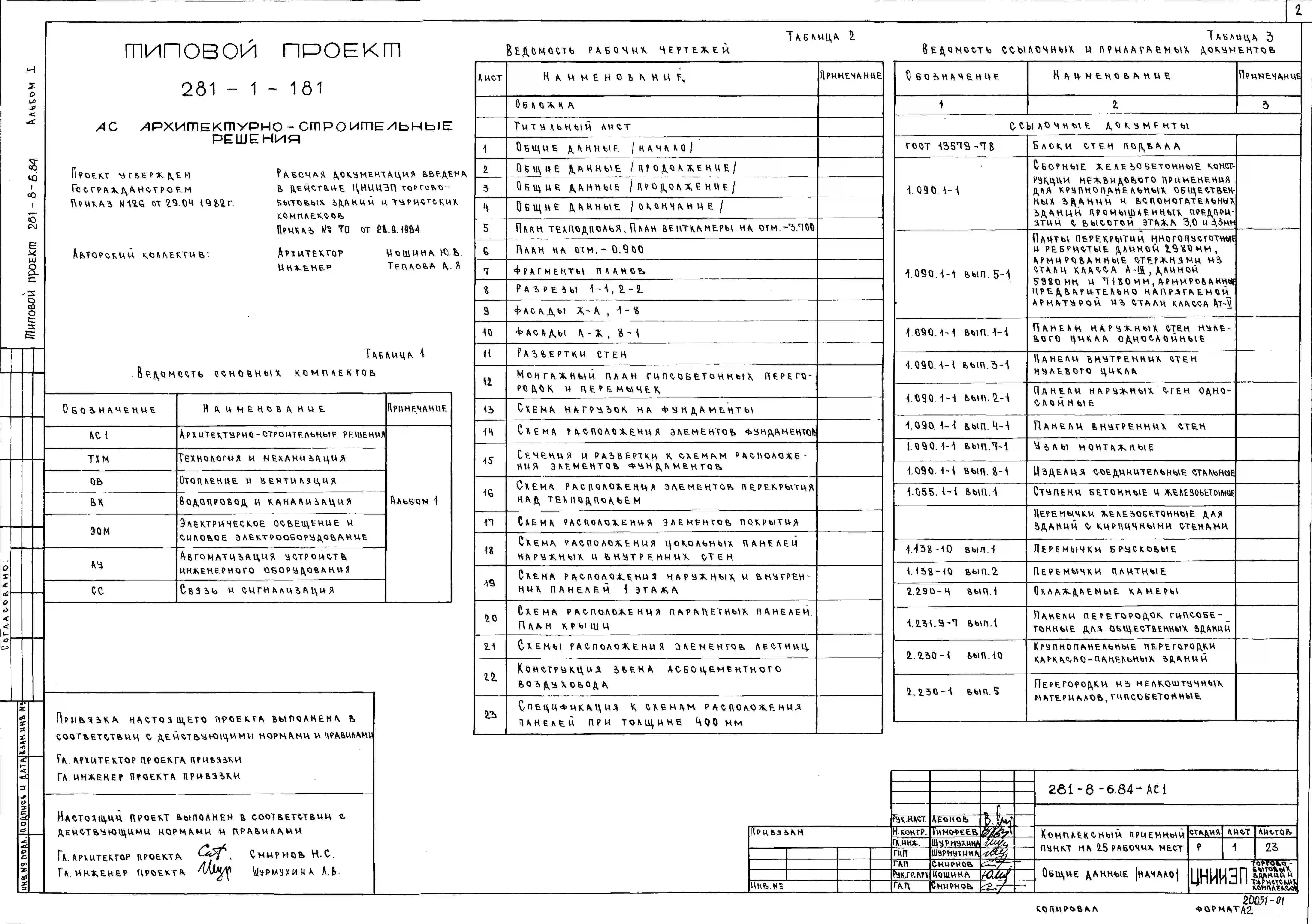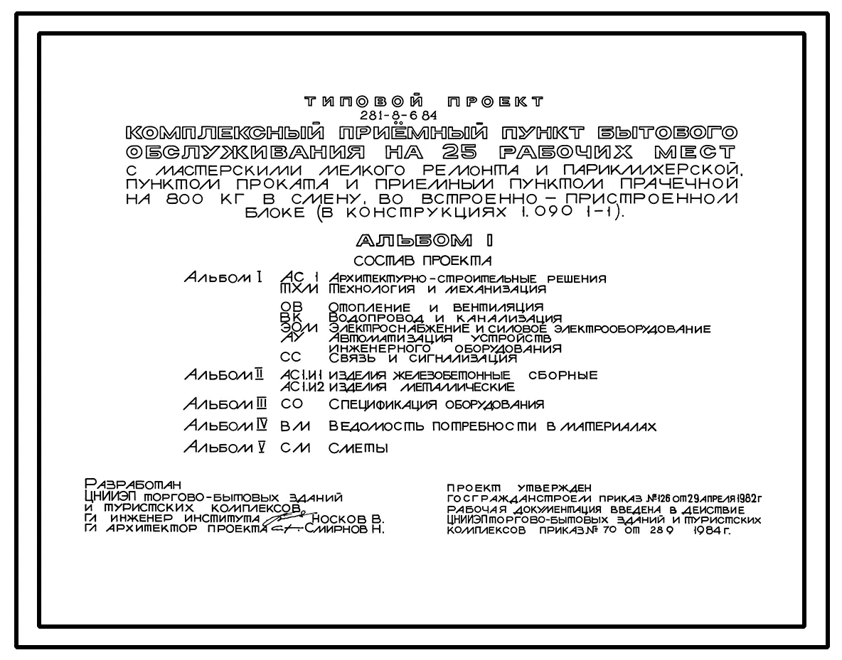 Типовой проект 281-8-6.84 Комплексный приемный пункт бытового обслуживания на 25 рабочих мест с мастерскими мелкого ремонта и парикмахерской, пунктом проката и приемным пунктом прачечной на 800 кг в смену во встроено – пристроенном блоке.