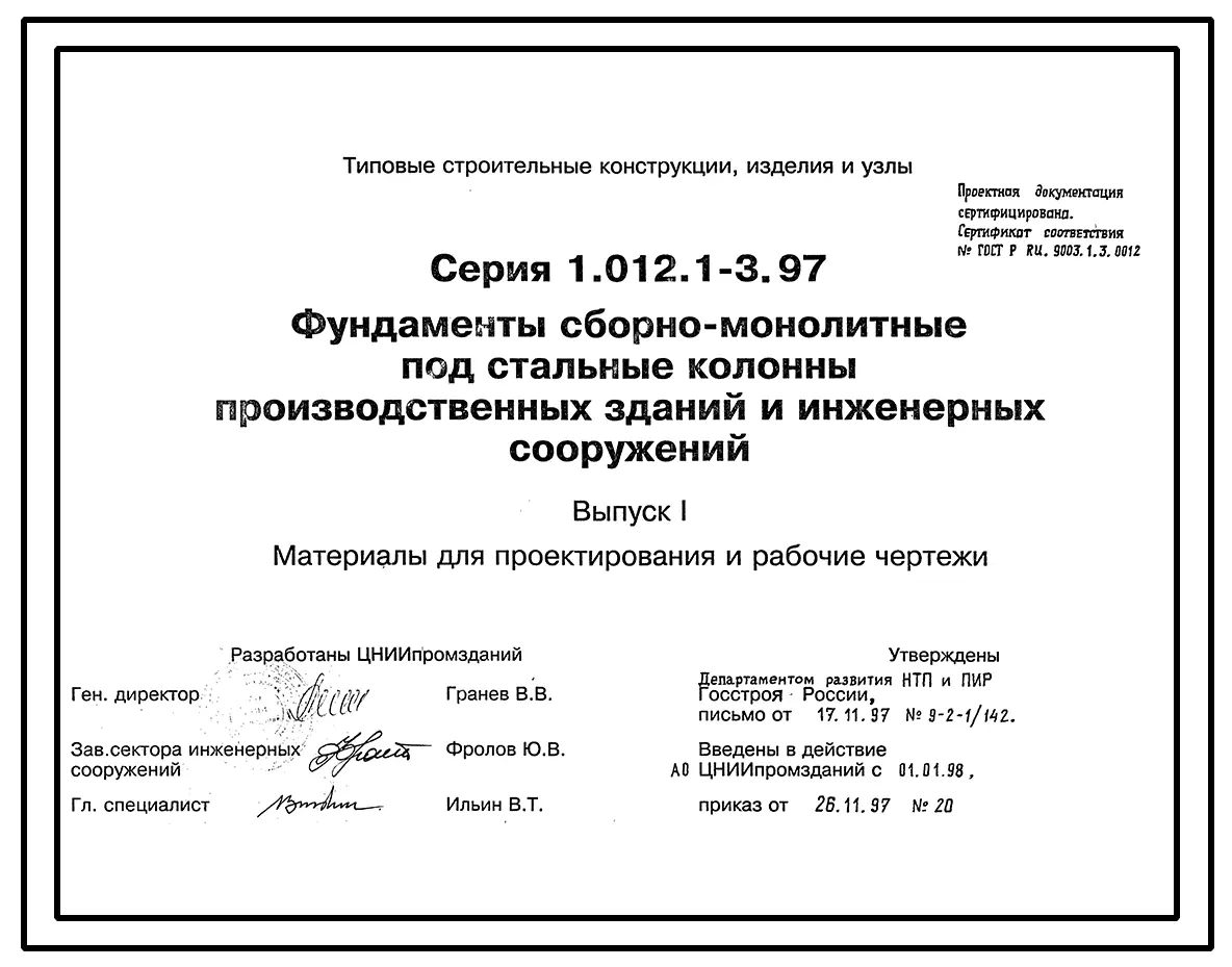 Серия 1.012.1-3.97 Фундаменты сборно-монолитные под стальные колонны производственных зданий и инженерных сооружений. Материалы для проектирования и рабочие чертежи.