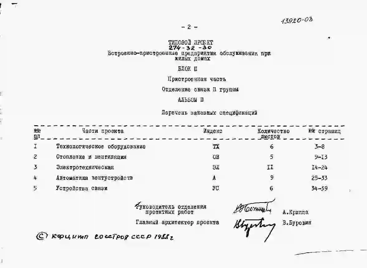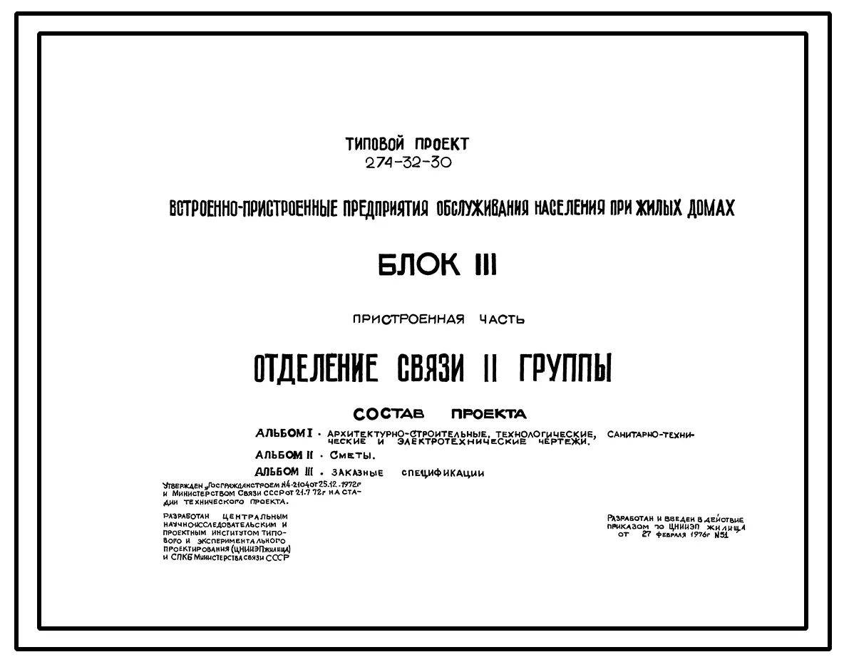 Типовой проект 274-32-30 Встроенно-пристроенные предприятия обслуживания населения при жилых домах. Блок 3. Отделение связи 2 группы.