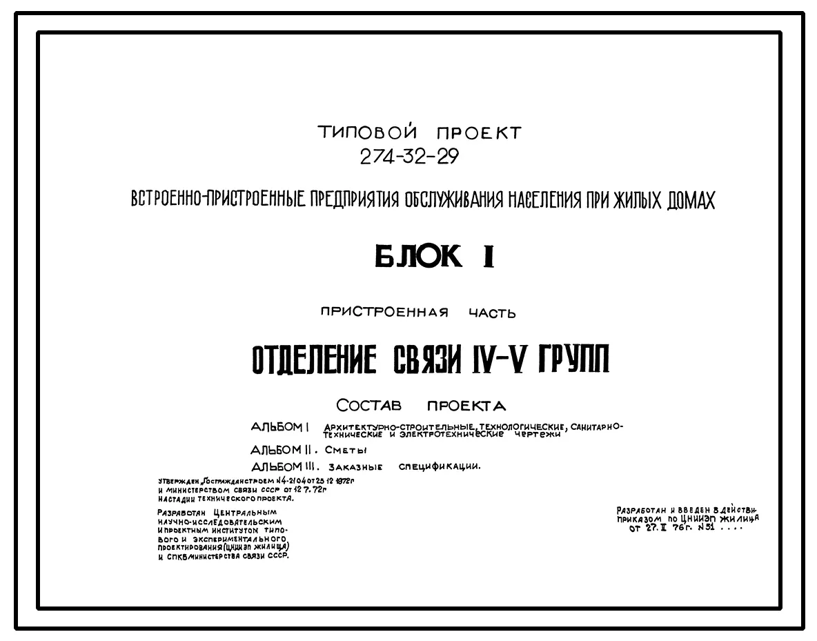 Типовой проект 274-32-29 Встроенно-пристроенные предприятия обслуживания населения при жилых домах. Блок 1. Отделение связи 4-5 группы.