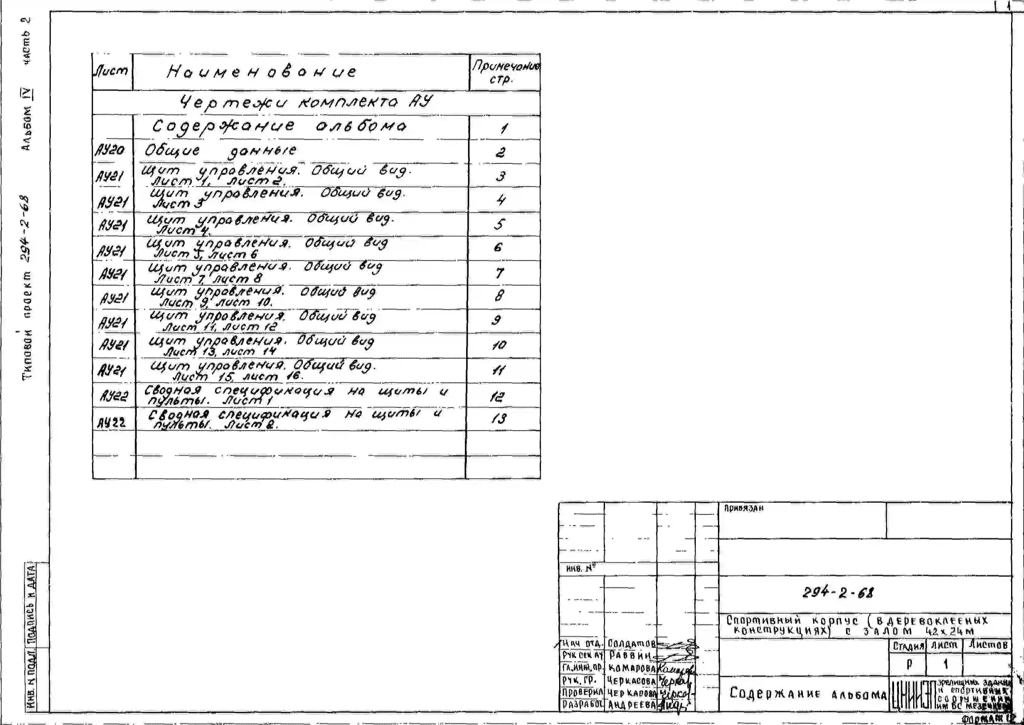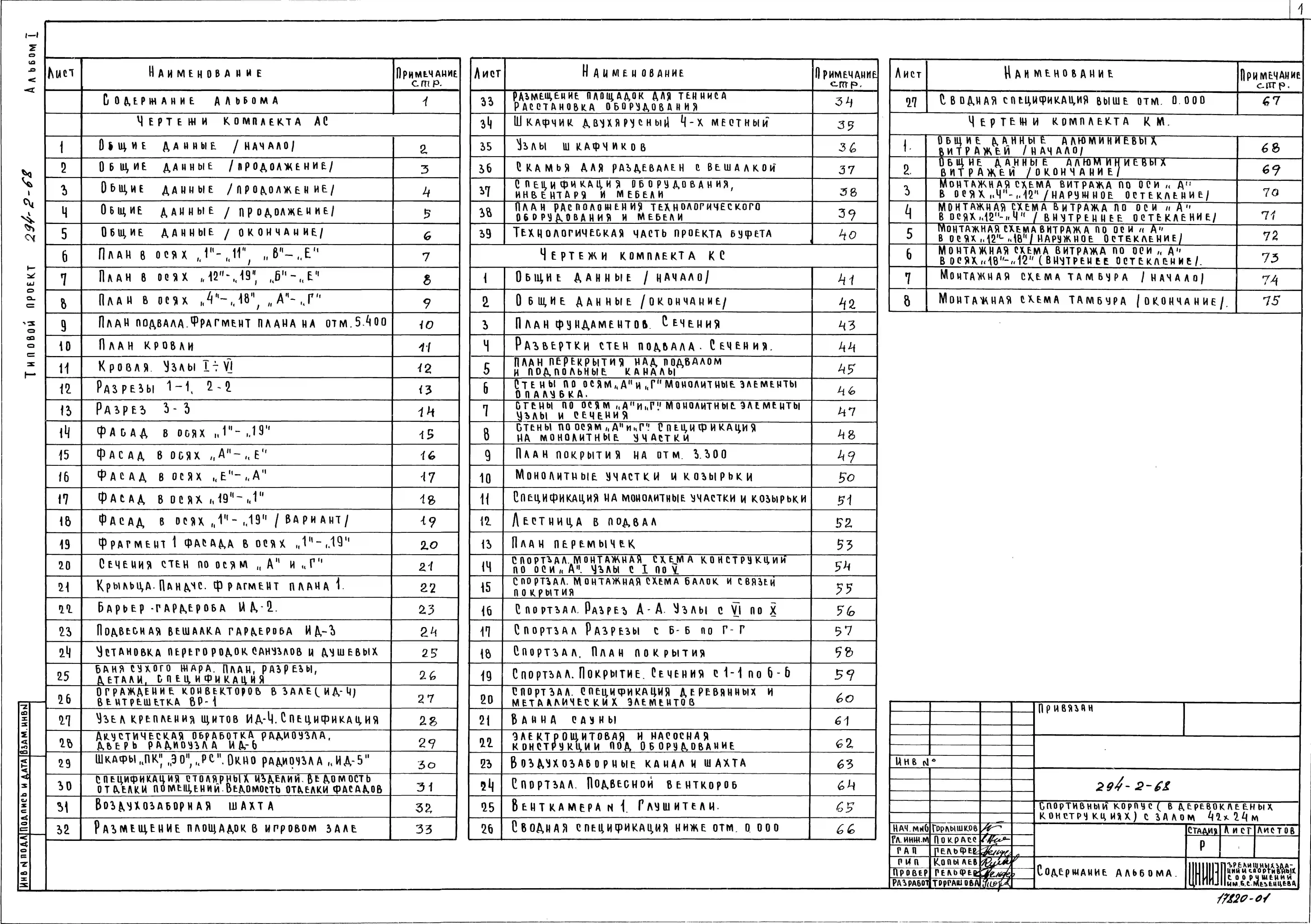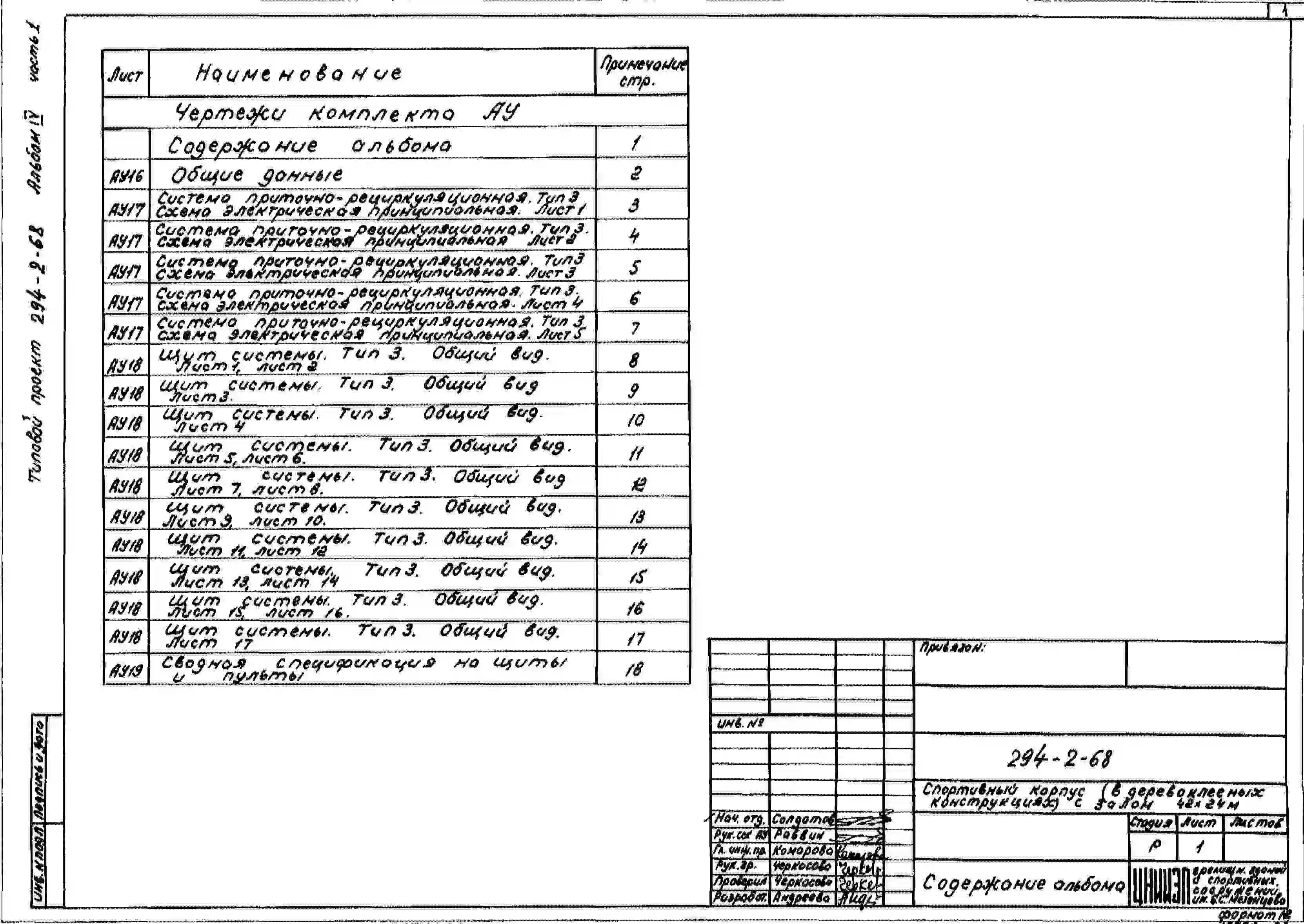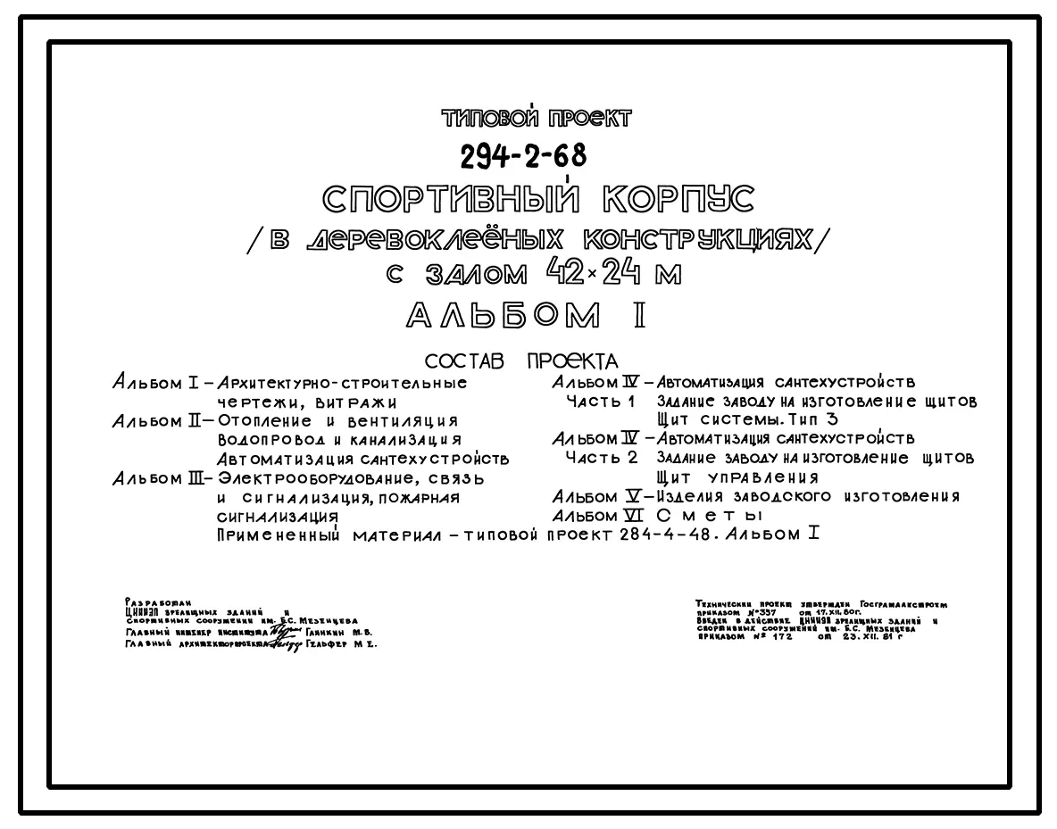 Типовой проект 294-2-68 Спортивный корпус с залом 42х24м. Здание одноэтажное. Покрытия игрового зала в деревоклееных конструкциях. Стены из кирпича.