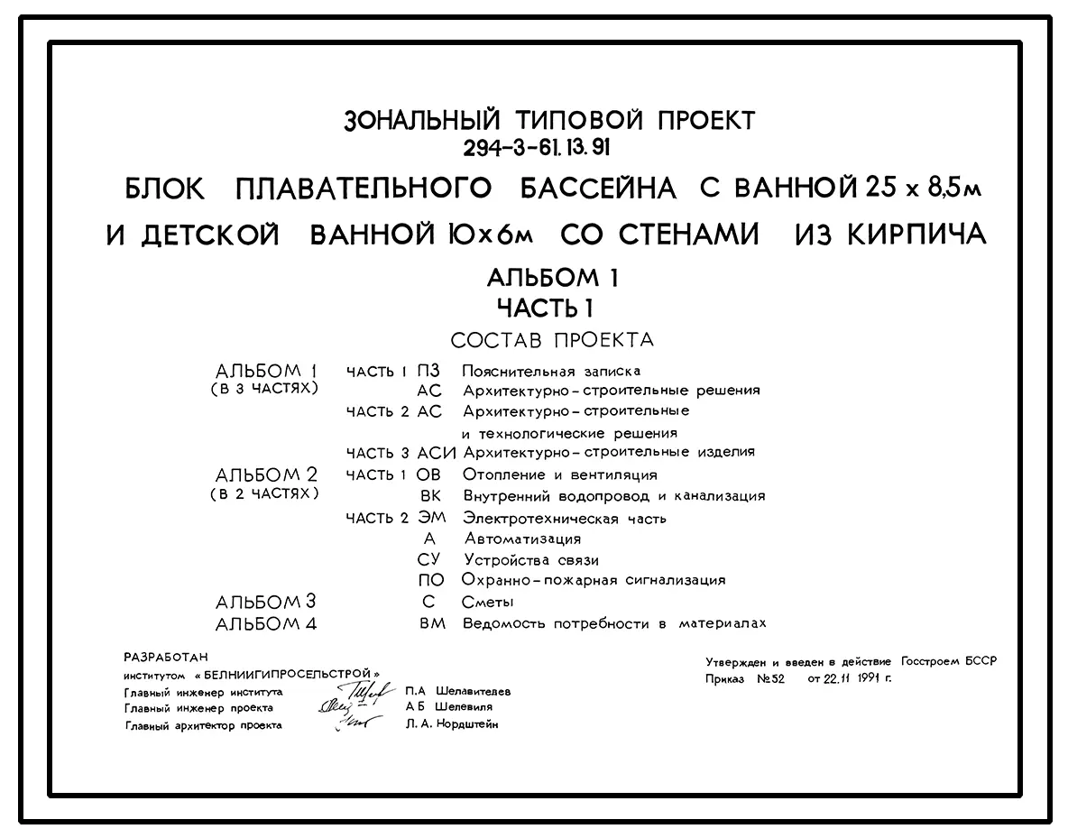 Типовой проект 294-3-61.13.91 Блок плавательного бассейна с ванной 25х8,5м и детской ванной 10х6м со стенами из кирпича для республики Беларусь