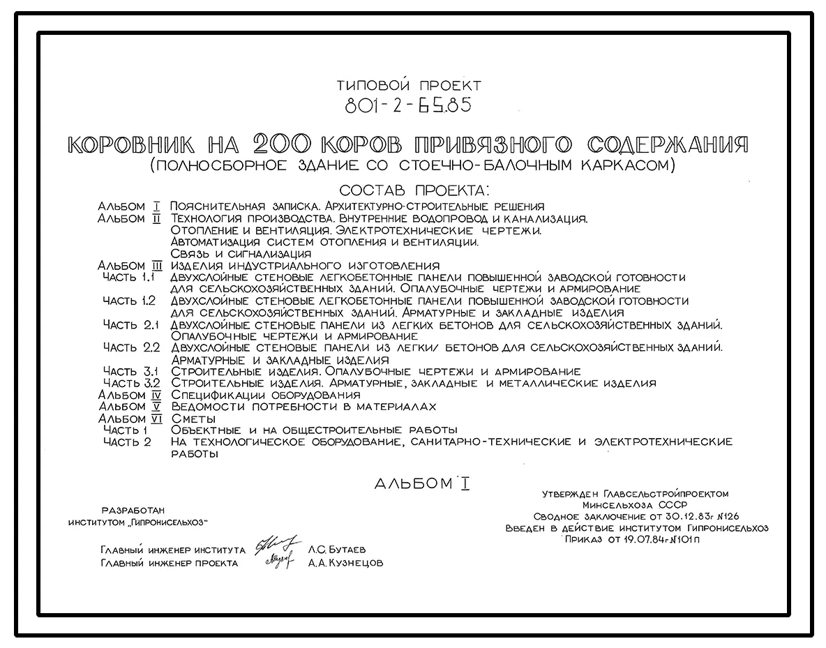 Типовой проект 801-2-65.85 Коровник на 200 коров привязного содержания (полносборное здание со стоечно-балочным каркасом). Доение - в молокопровод или доильные ведра. Раздача кормов – мобильная. Удаление навоза – транспортерами. Размеры здания - 21x72 м.