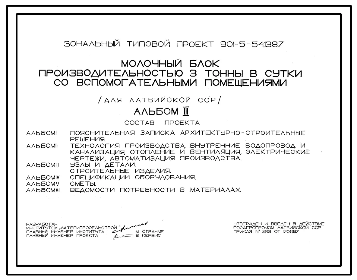 Типовой проект 801-5-54.13.87 Молочный блок производительностью 3 тонны в сутки со вспомогательными помещениями (для строительства в Латвийской ССР)