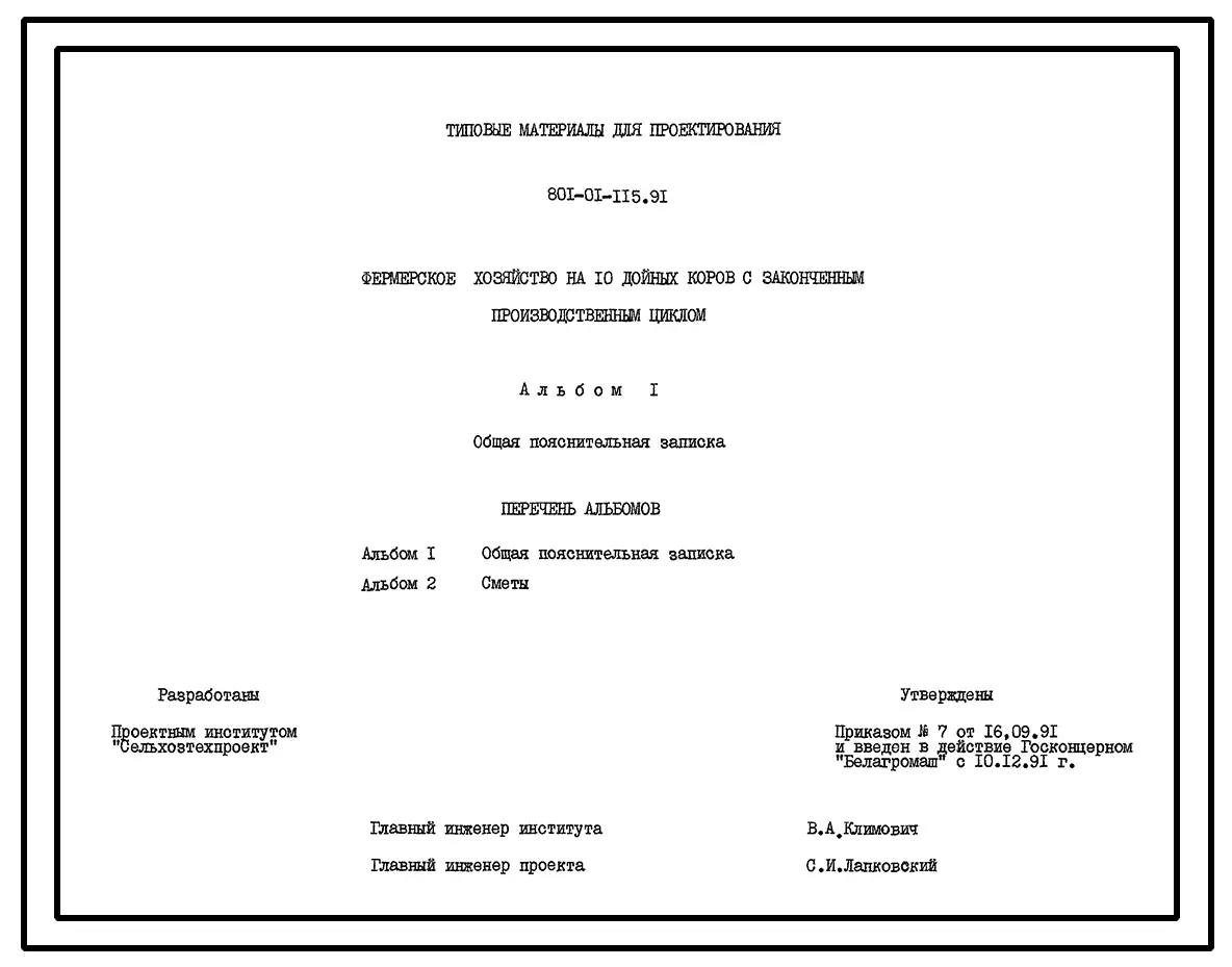 Типовой проект 801-01-115.91 Фермерское хозяйство на 10 дойных коров с законченным производственным циклом