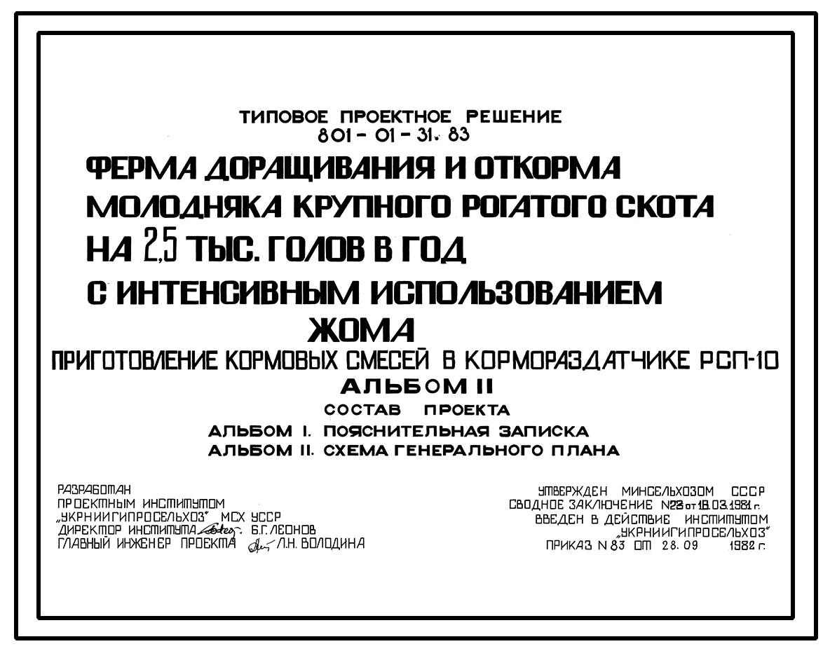 Типовой проект 801-01-31.83 Ферма доращивания и откорма молодняка курпного рогатого скота 2,5 тыс. голов в год с интенсивным использованием жома (приготовление кормовых смесей в кормораздатчике РСП-10)