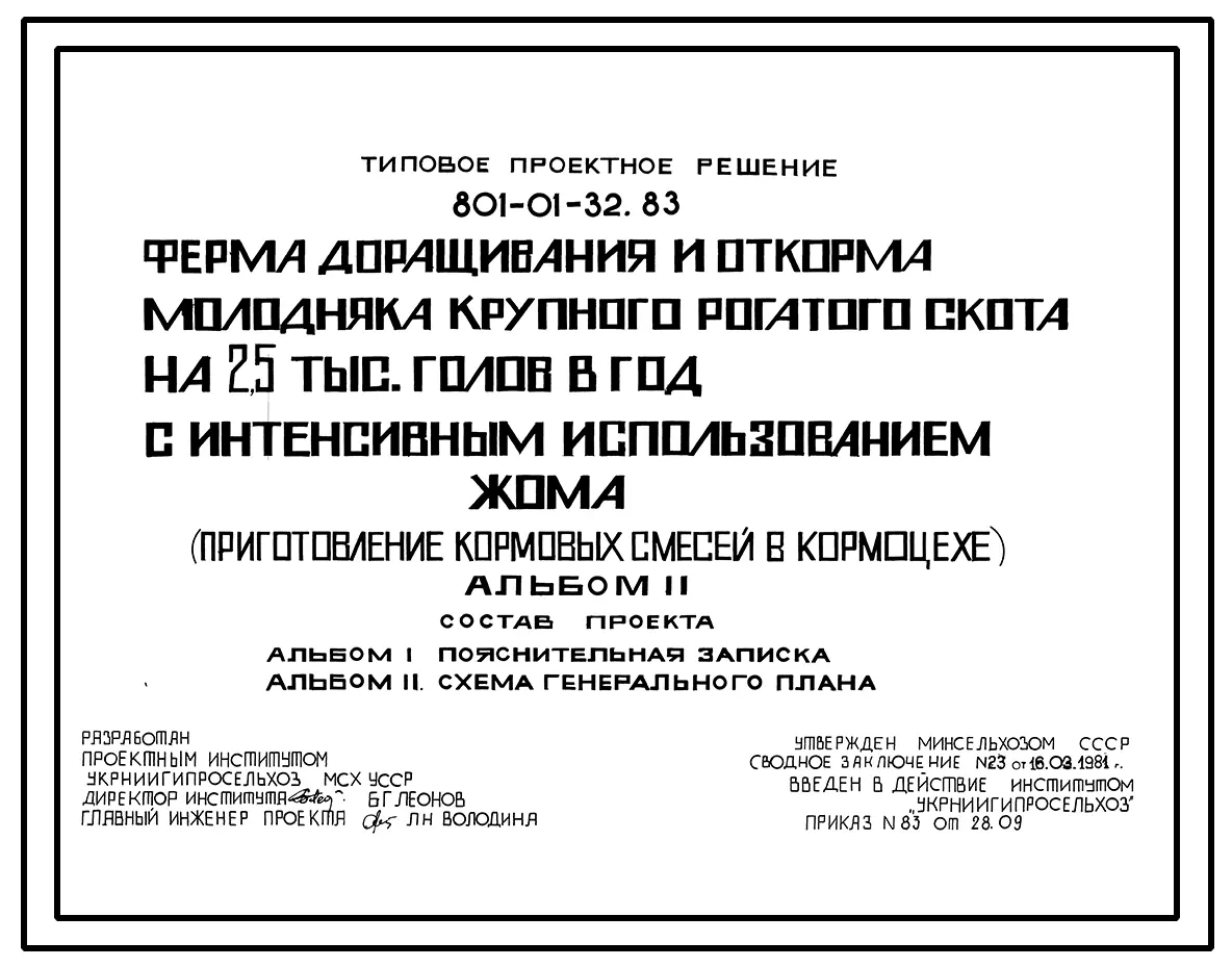 Типовой проект 801-01-32.83 Ферма доращивания и откорма молодняка крупного рогатого скота 2,5 тыс. голов в год с интенсивным использованием жома (приготовление кормовых смесей в кормоцехе)