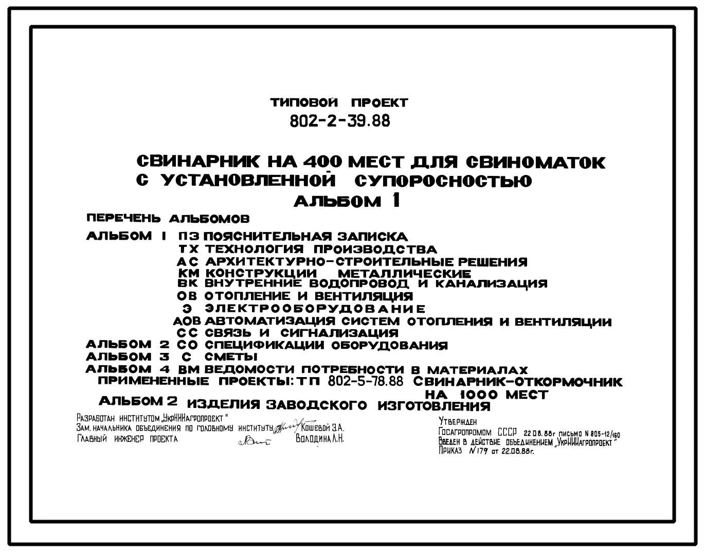 Типовой проект 802-2-39.88 Свинарник на 400 мест для свиноматок с установленной супоросностью (длина 66 м., ширина 18м.)