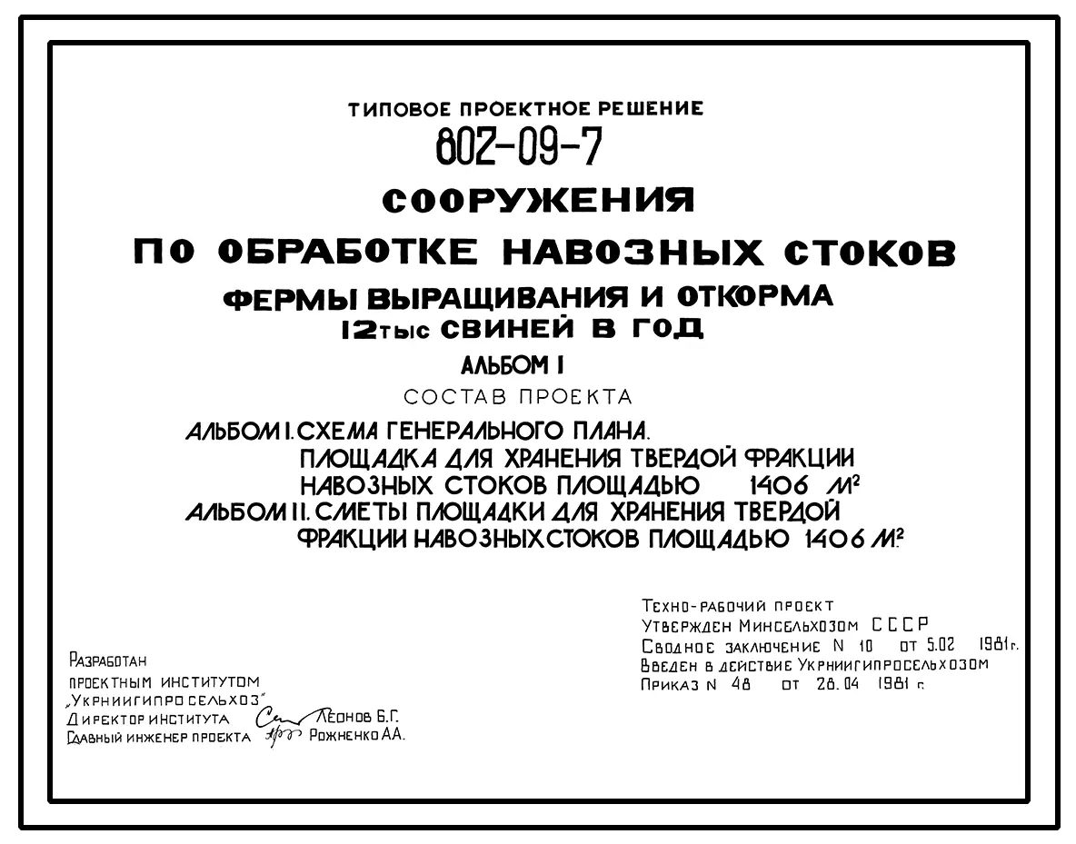 Типовой проект 802-09-7 Сооружения по обработке навозных стоков фермы выращивания и откорма 12 тыс. свиней в год