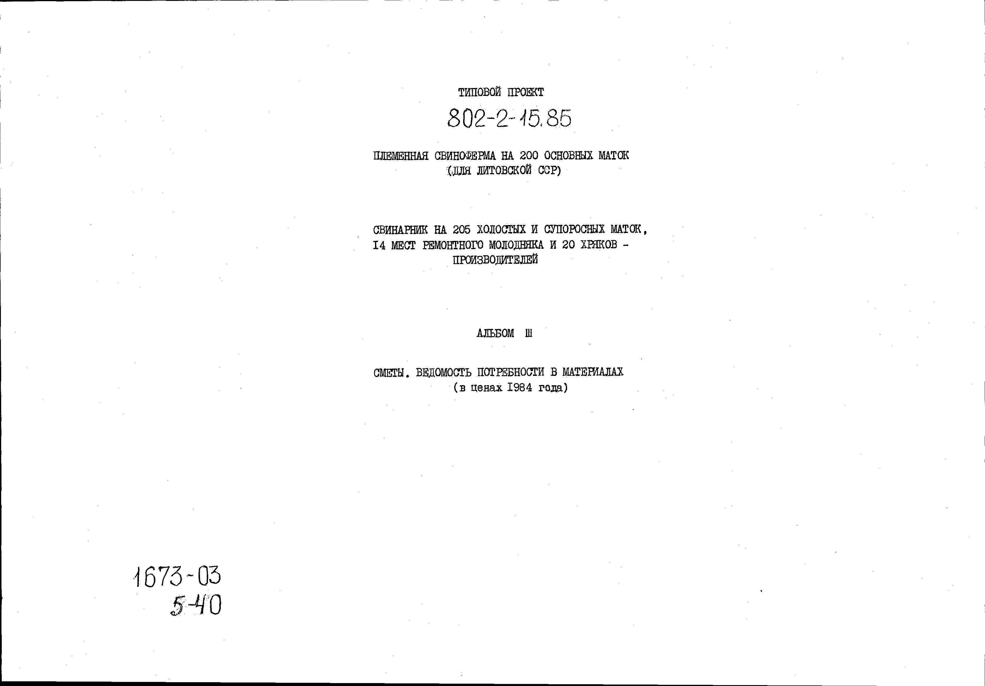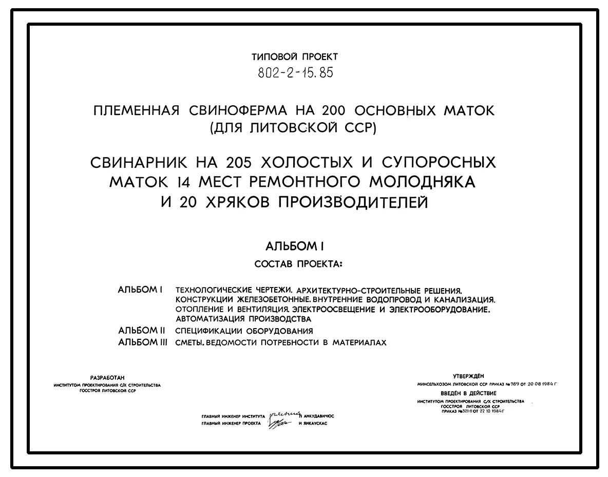 Типовой проект 802-2-15.85 Свинарник на 205 холостых и супоросных маток, 14 мест ремонтного молодняка и 20 хряков производителей.