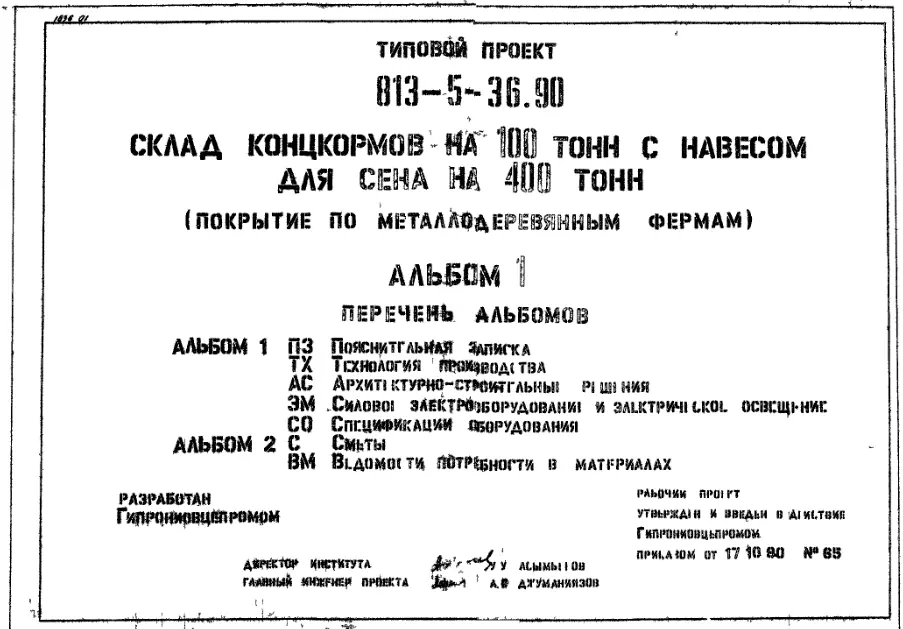 Типовой проект 813-5-36.90 Склад концкормов на 100 т с навесом для сена на 400 т. Размеры здания - 12x66 м. Расчетная температура: -25°С. Стены – кирпичные. Покрытие - асбестоцементные листы по металлодеревянным фермам