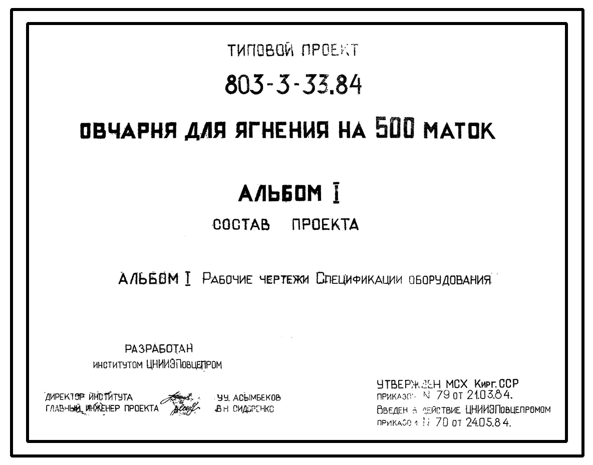 Типовой проект 803-3-33с.84 Овчарня для ягнения на 500 маток. Для строительства в районах Киргизской ССР сейсмичностью 7,8,9 баллов.