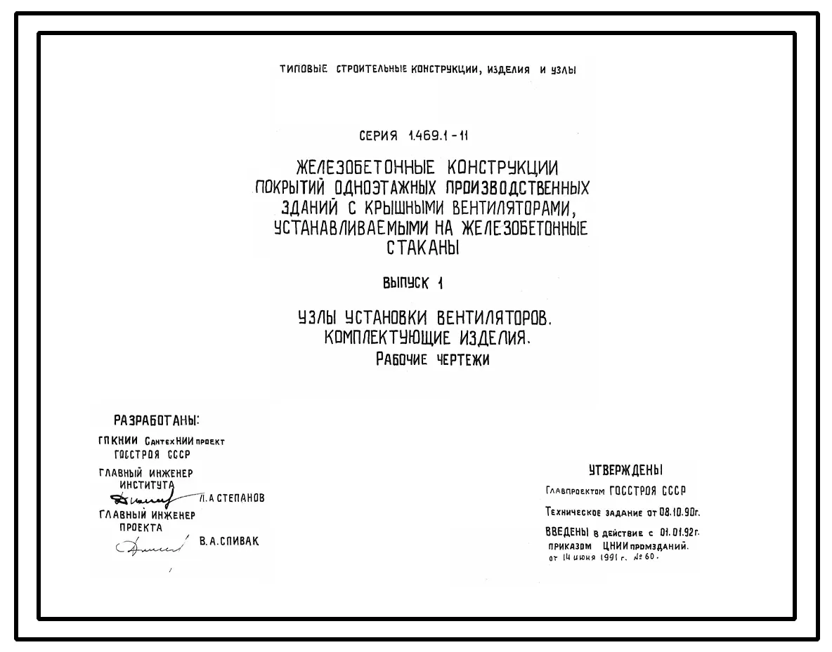 Серия 1.469.1-11 Железобетонные конструкции покрытий одноэтажных производственных зданий с крышными вентиляторами, устанавливаемыми на железобетонные стаканы. Материалы для проектирования и рабочие чертежи.