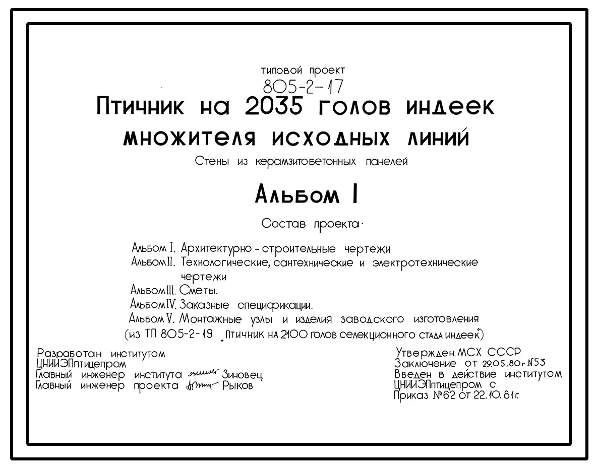 Типовой проект 805-2-17 ПТИЧНИК НА 2035 ГОЛОВ ИНДЕЕК МНОЖИТЕЛЯ ИСХОДНЫХ ЛИНИЙ СТЕНЫ ИЗ КЕРАМЗИТОБЕТОННЫХ ПАНЕЛЕЙ.