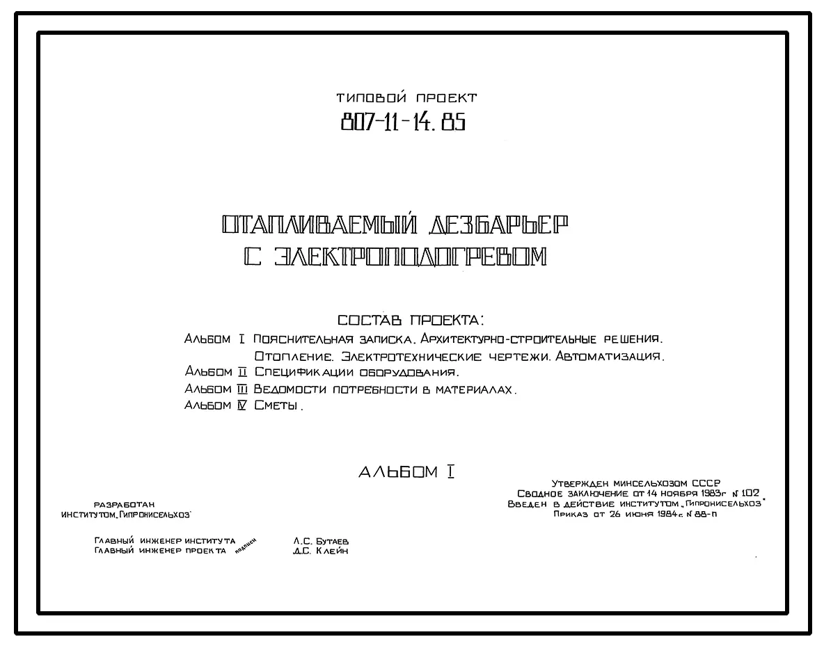 Типовой проект 807-11-14.85 Отапливаемый дезбарьер с электроподогревом. Размеры -6x12 м. Расчетная температура -20, -30°С. Покрытие - асбестоцементные листы по железобетонным прогонам и фермам