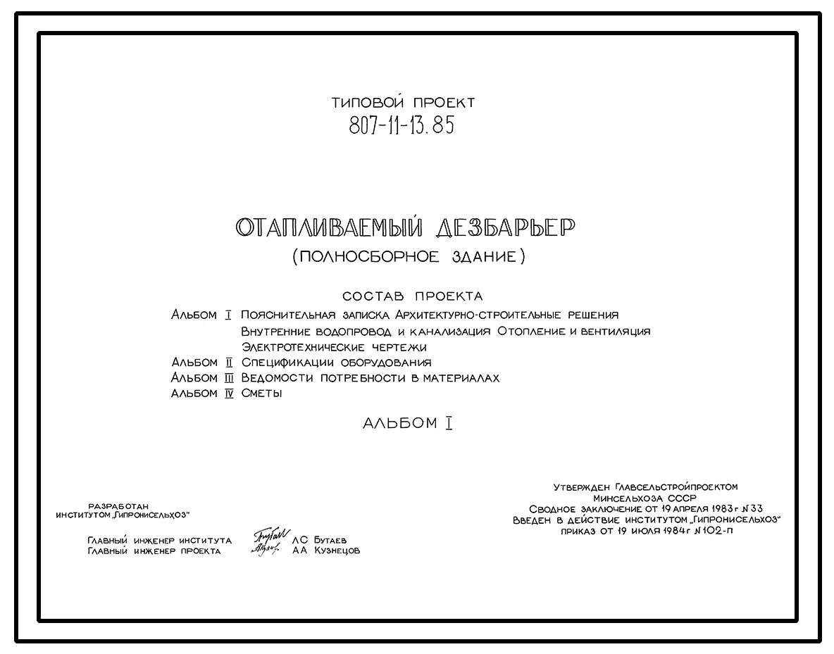 Типовой проект 807-11-13.85 Отапливаемый дезбарьер (полносборное здание). Размеры - 6x12 м. Расчетная температура: -20, -30°С. Покрытие - асбестоцементные листы по железобетонным прогонам и фермам