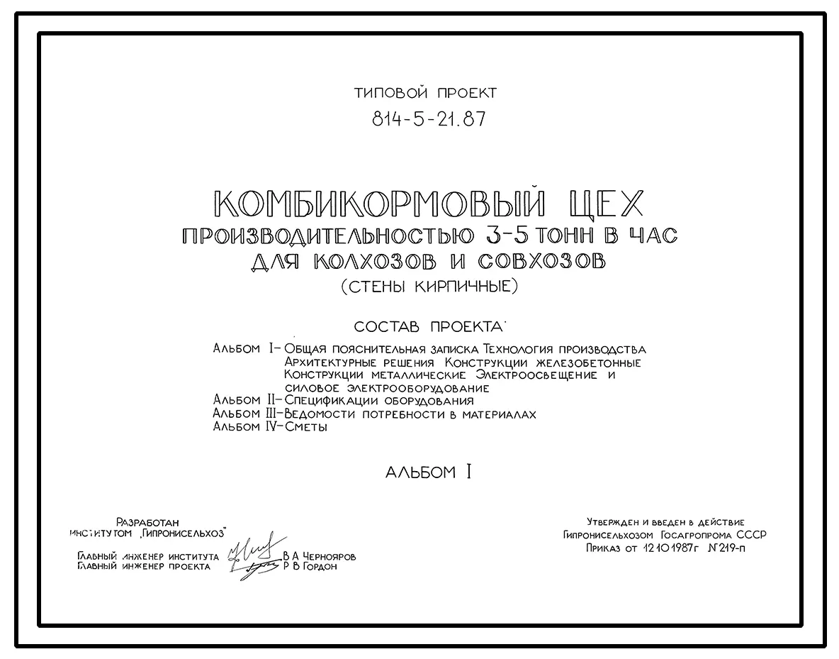 Типовой проект 814-5-21.87 Комбикормовый цех производительностью 3-5т/ч. Разработан на базе малогабаритной установки УМК-Ф-2. Комбикорма вырабатываются из зерновых культур, гранулированной травяной муки, белкововитаминных добавок и др. Общая численность р
