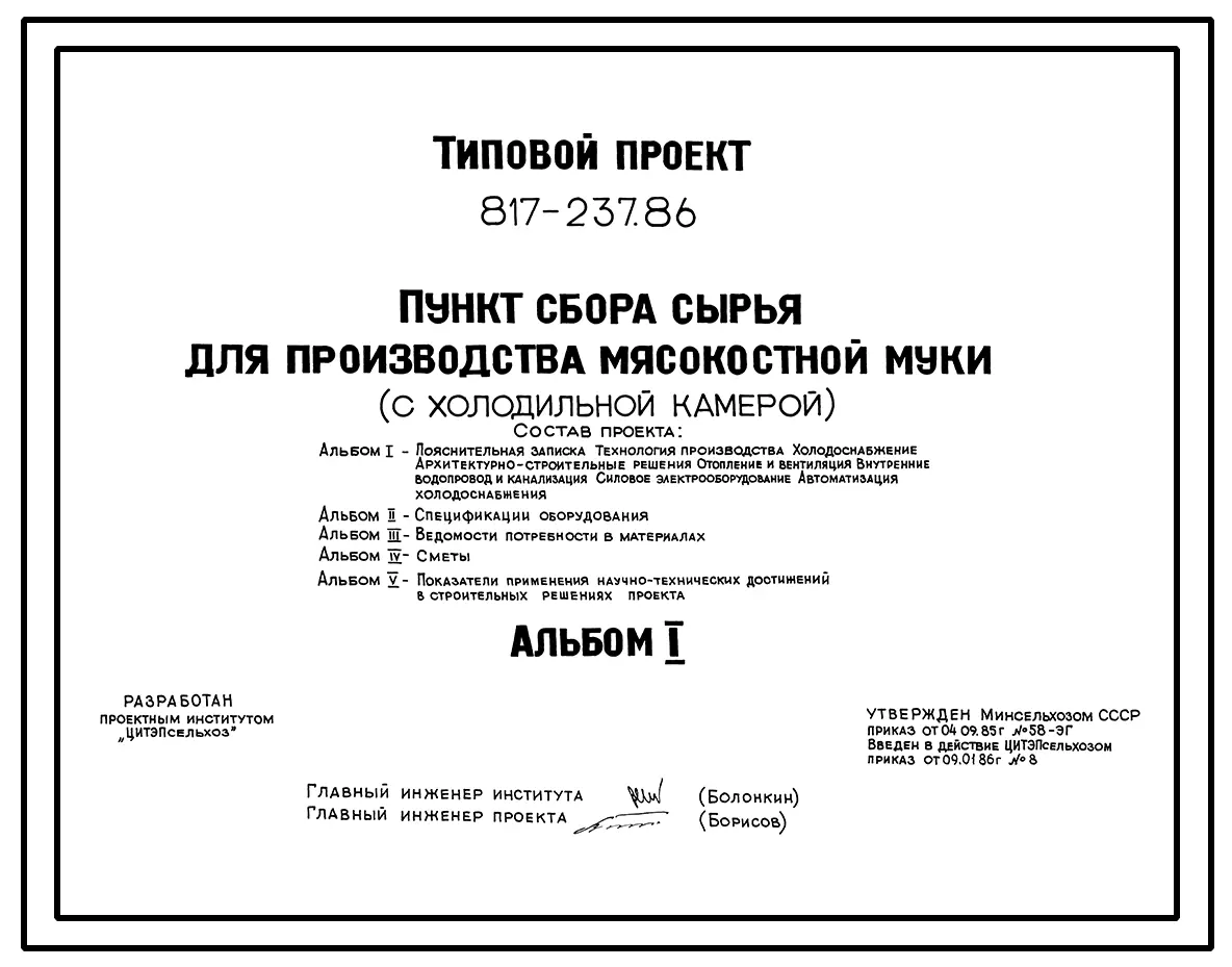 Типовой проект 817-237.86 Пункт сбора сырья для производства мясокостной муки (с холодильной камерой). Размеры здания - 6x6 м. Расчетная температура: -20, -30, -40°С. Стены - панельные легкобетонные. Покрытие - железобетонные плиты по железобетонным балка