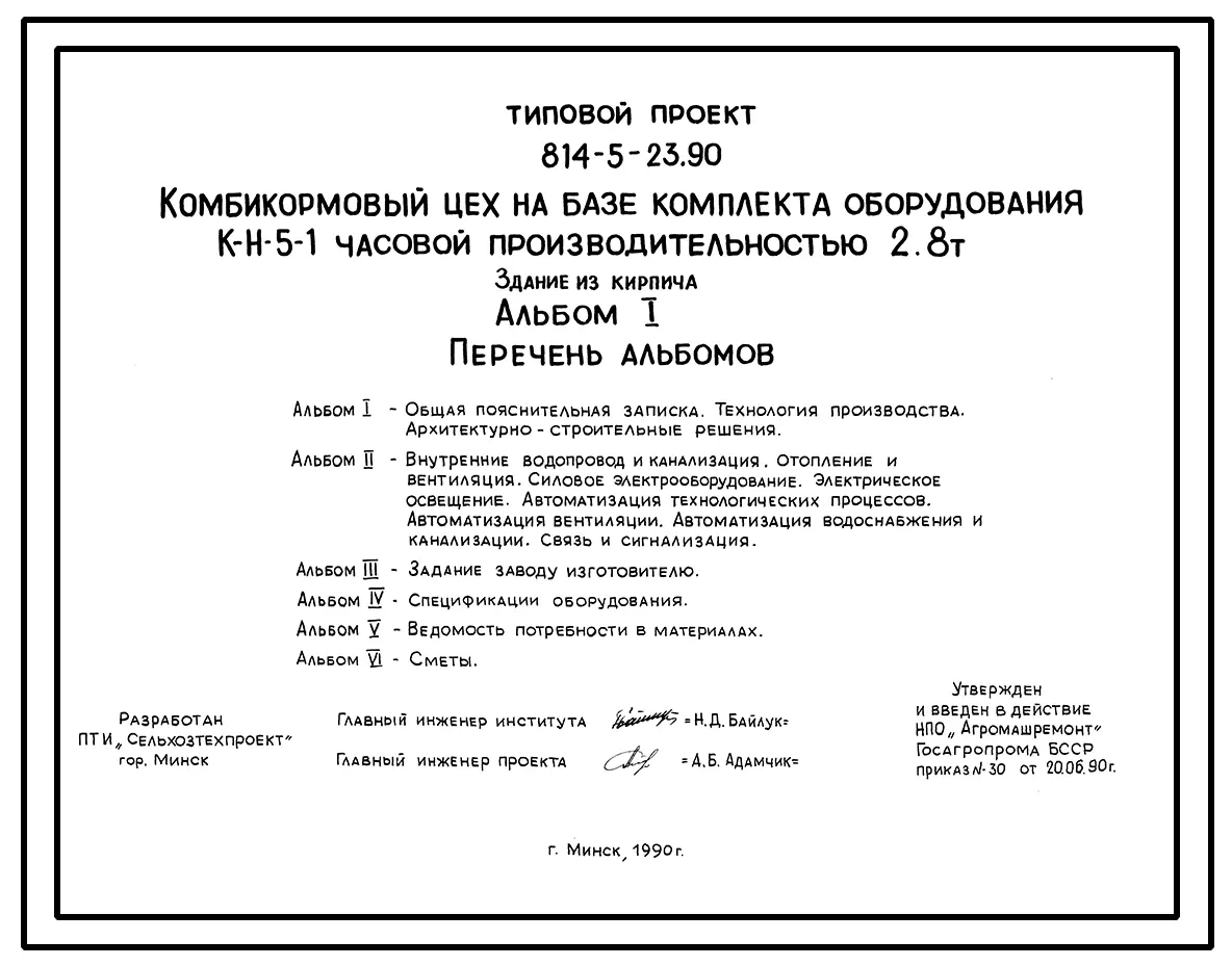 Типовой проект 814-5-23.90 Комбикормовый цех на базе комплекта оборудования К-Н-5-1 часовой производительностью 2,8 т со стенами из кирпича