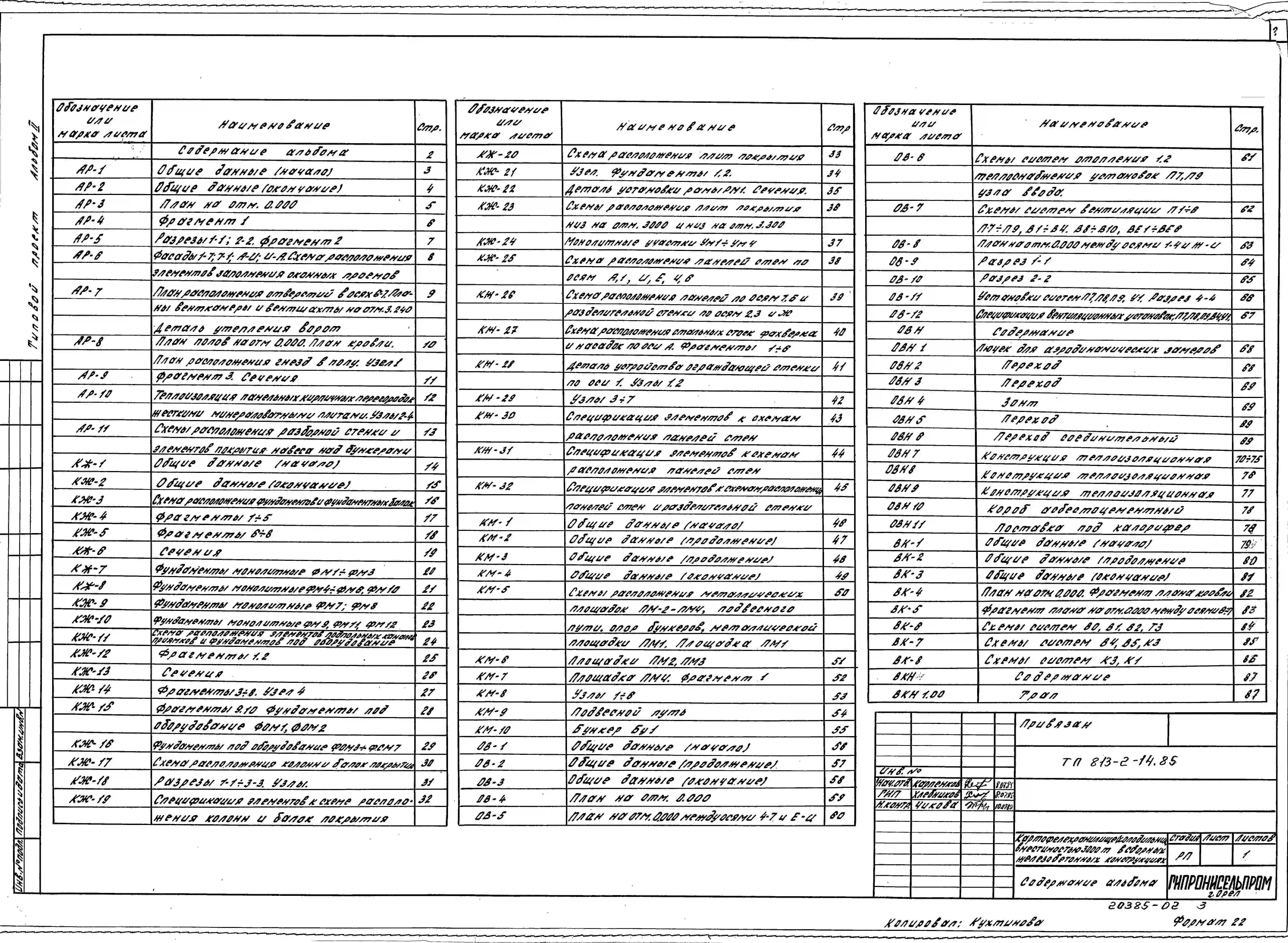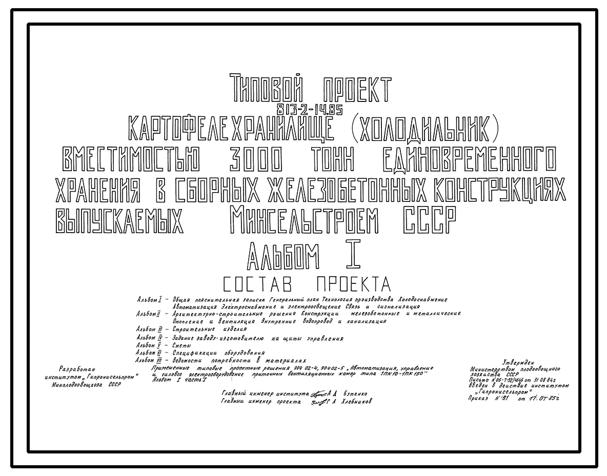 Типовой проект 813-2-14.85 Картофелехранилище (холодильник) вместимостью 3000 т единовременного хранения. Предназначено для хранения с охлаждением и предреализационной обработки продовольственного картофеля. Размеры здания - 42x60,6 м. Расчетная температу
