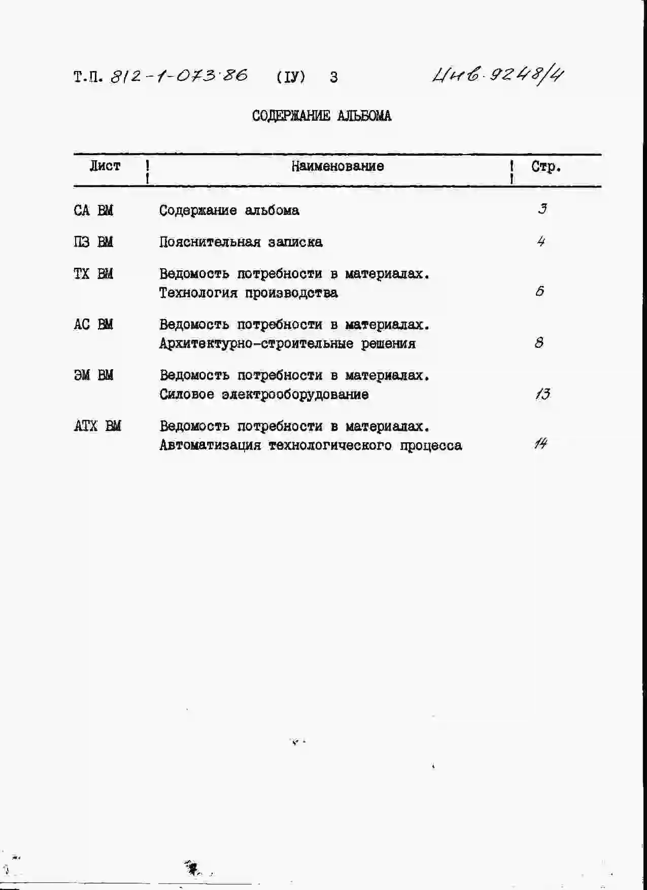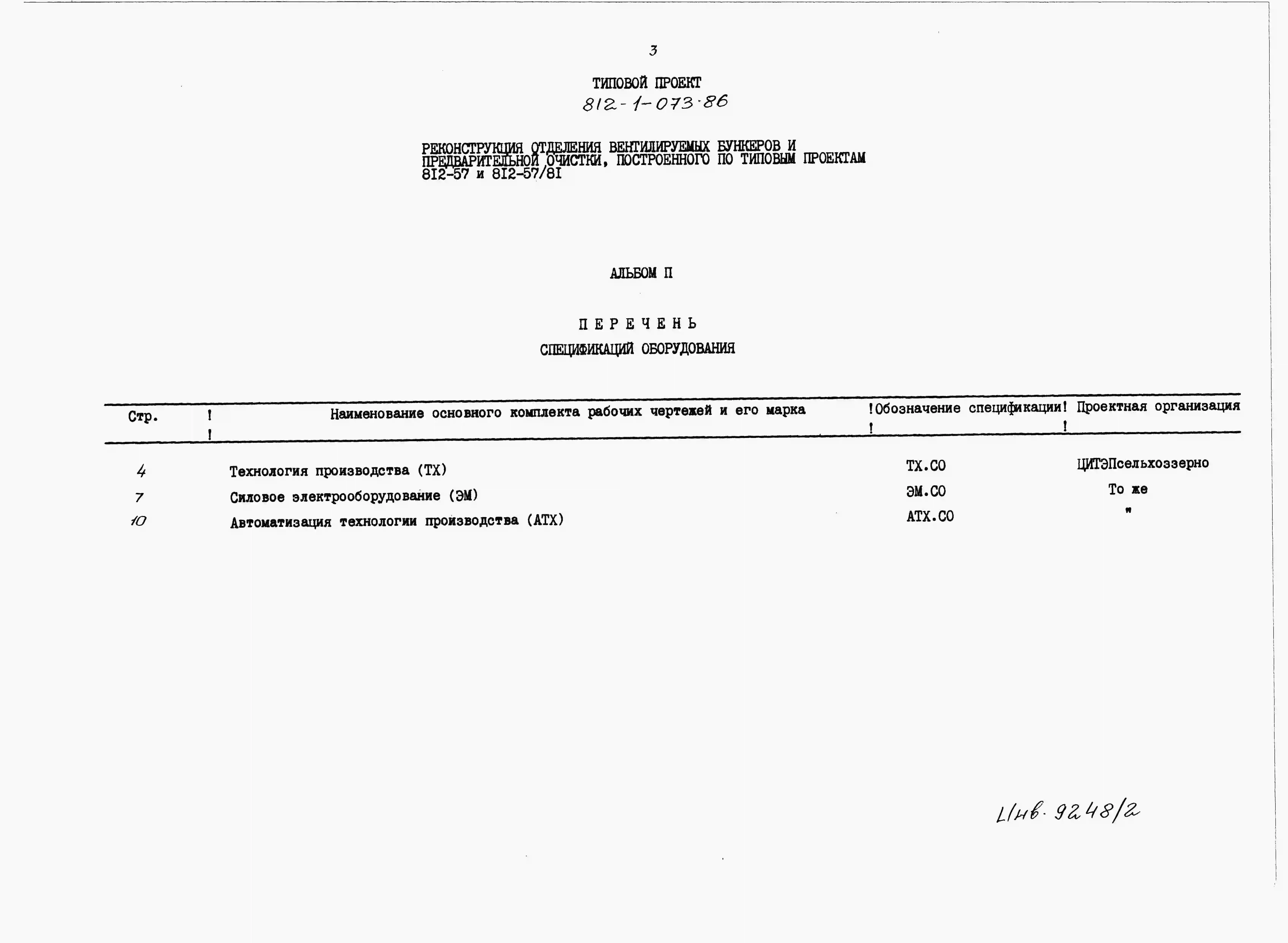 Типовой проект 812-1-073.86 Реконструкция отделения вентилируемых бункеров и предварительной очистки построенного по типовым проектам 812-57 и 812-57/81