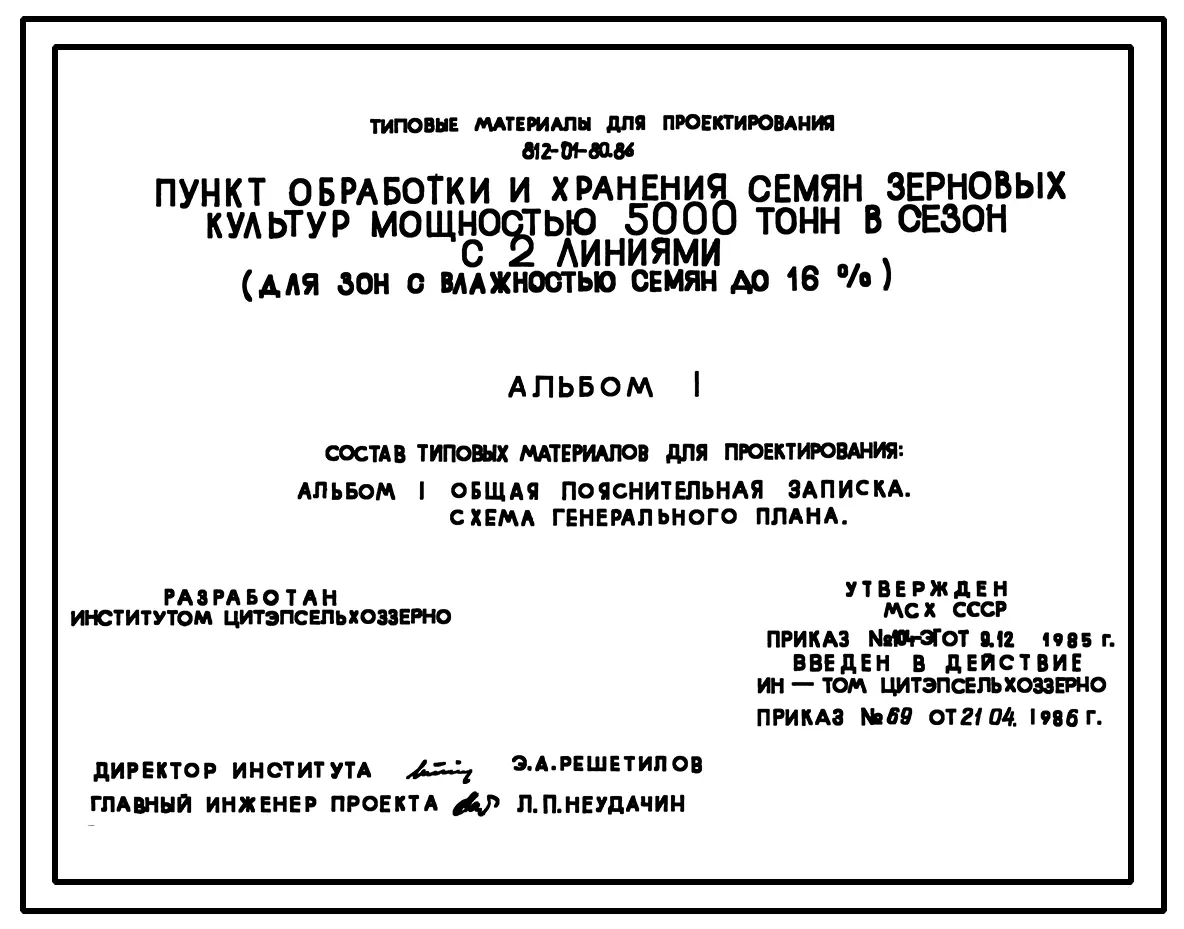 Типовой проект 812-01-80.86 Пункт обработки и хранения семян зерновых культур мощностью 5000 т в сезон с 2 линиями ( для зон с влажностью семян до 16%)