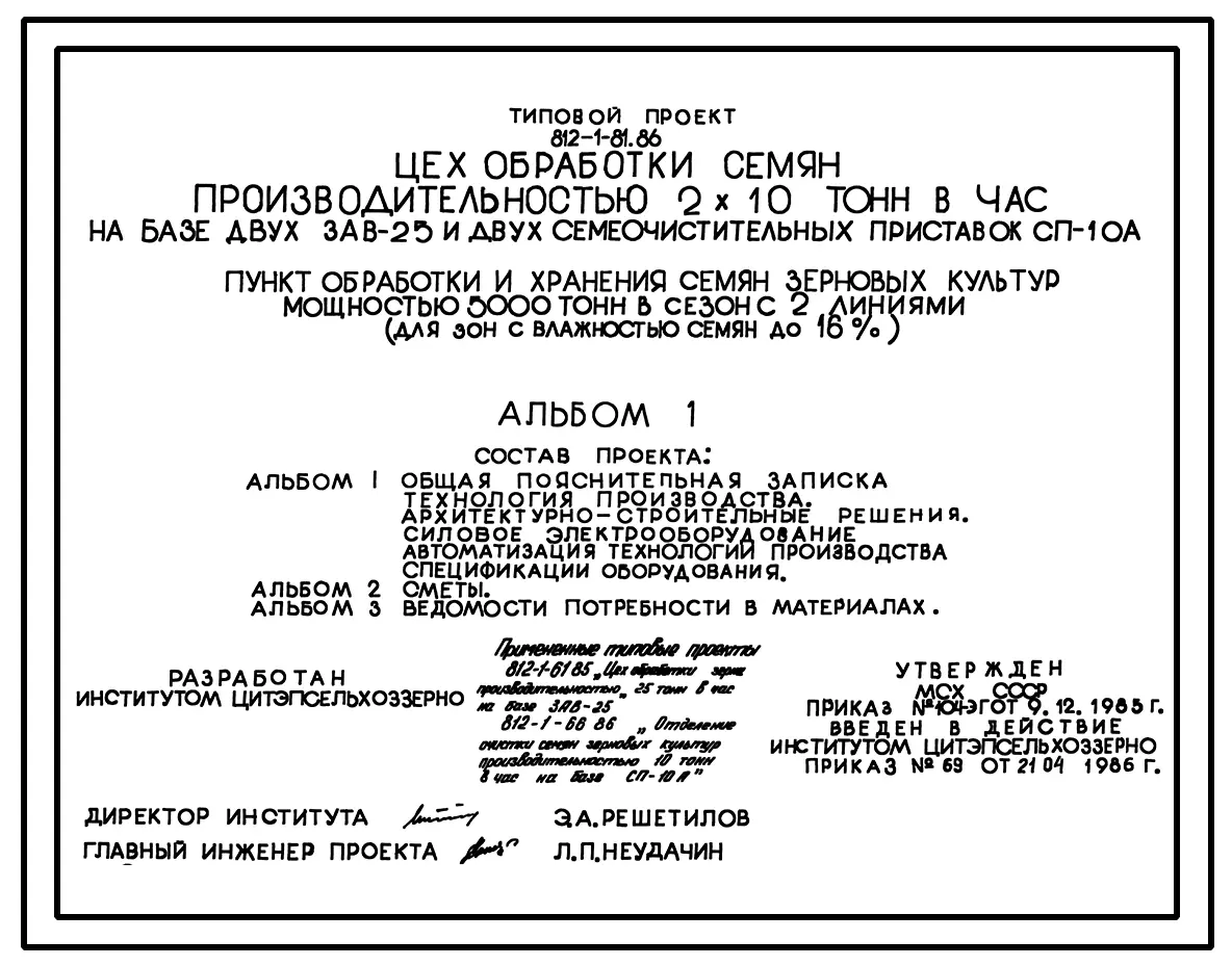 Типовой проект 812-1-81.86 Цех обработки семян производительностью 2х10 т/ч (на базе двух ЗАВ-25 и двух семяочистительных приставок СП-10А)